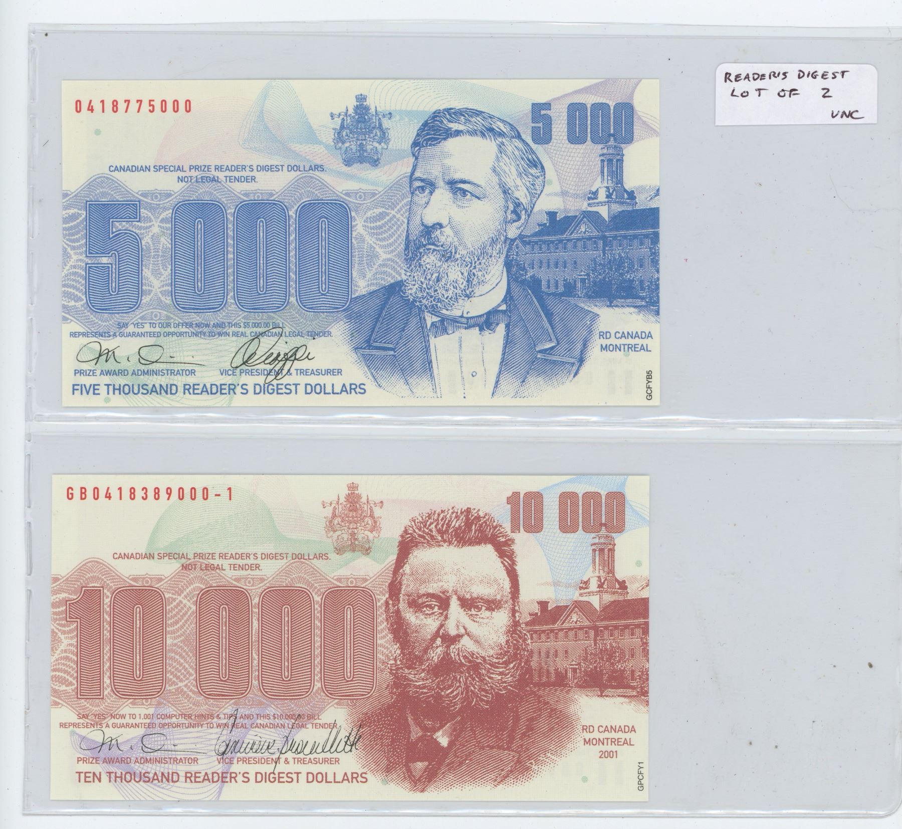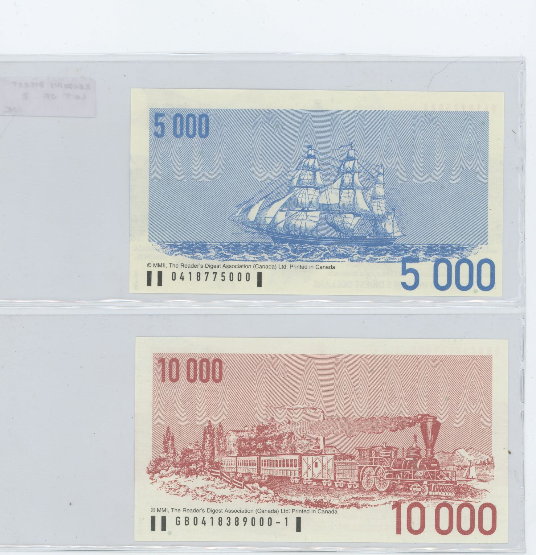 Lot of 2 different Reader’s Digest notes: 5000 & 10000 Reader’s Digest Dollars Scrip. Both Unc.