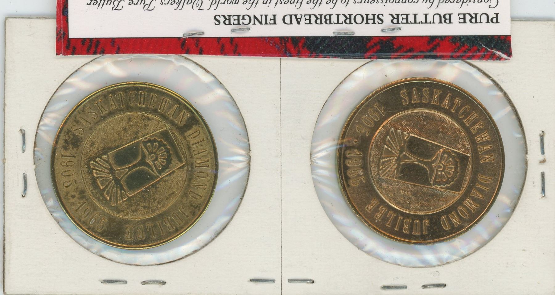 Lot of 2 different Saskatchewan Diamond Jubilee 1905-1965 medals. One has tail on the horse, while the other has no tail. Both Unc.