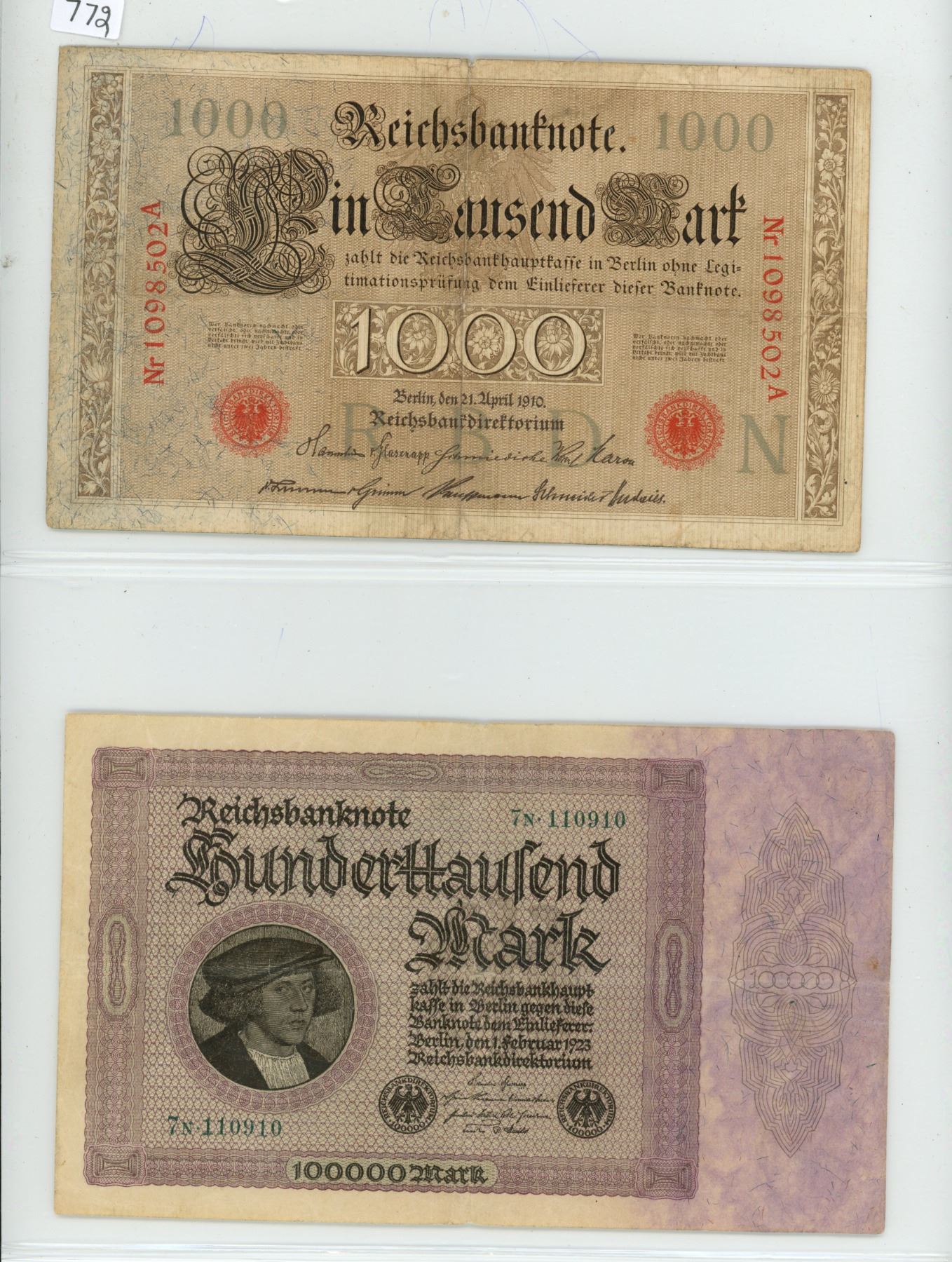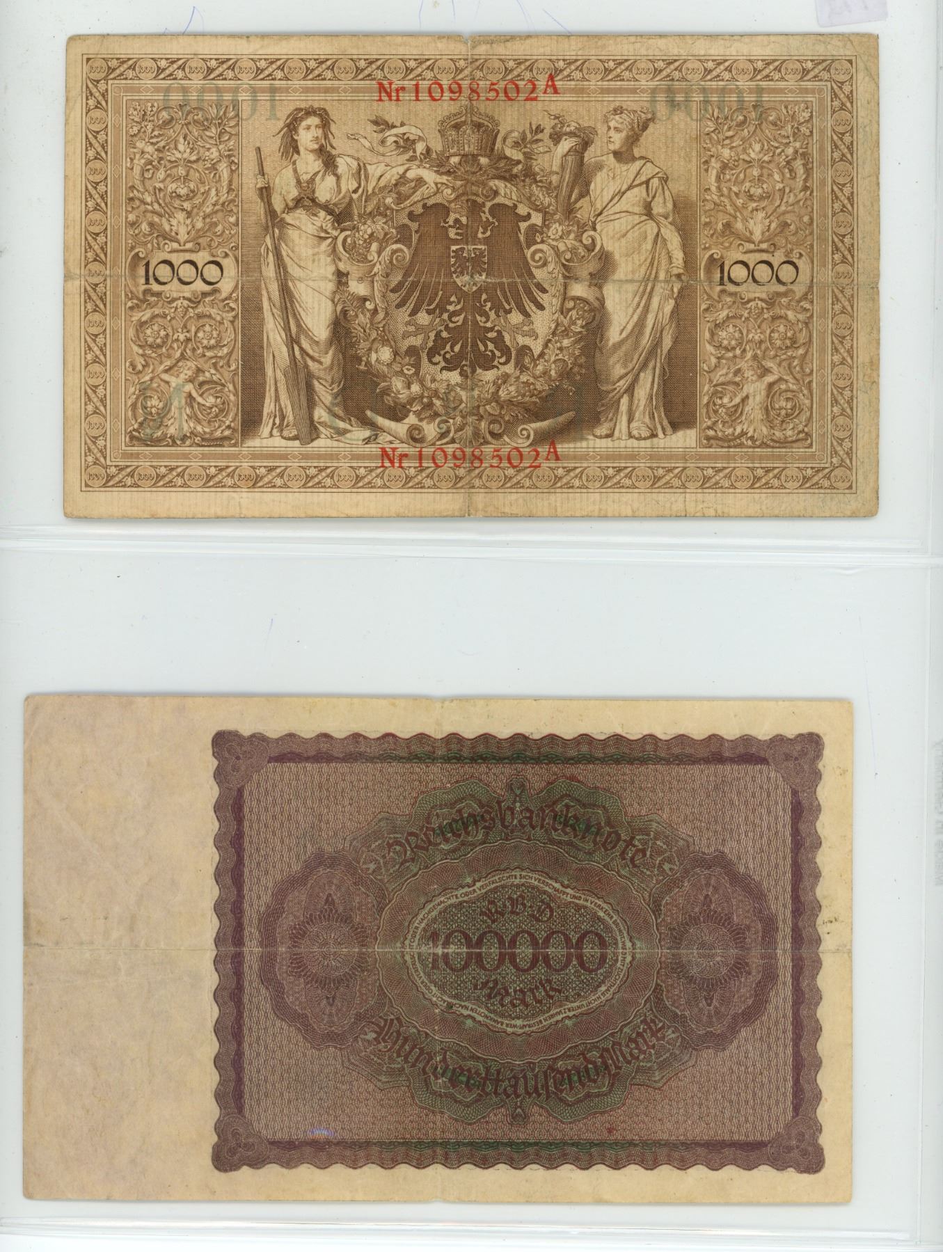 Lot of 2 germany bills: 1000 mark 1910 & 100,000 mark 1923