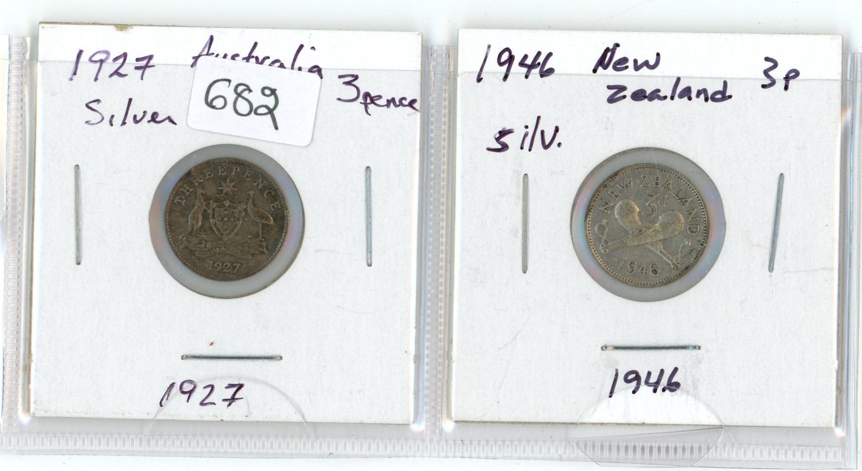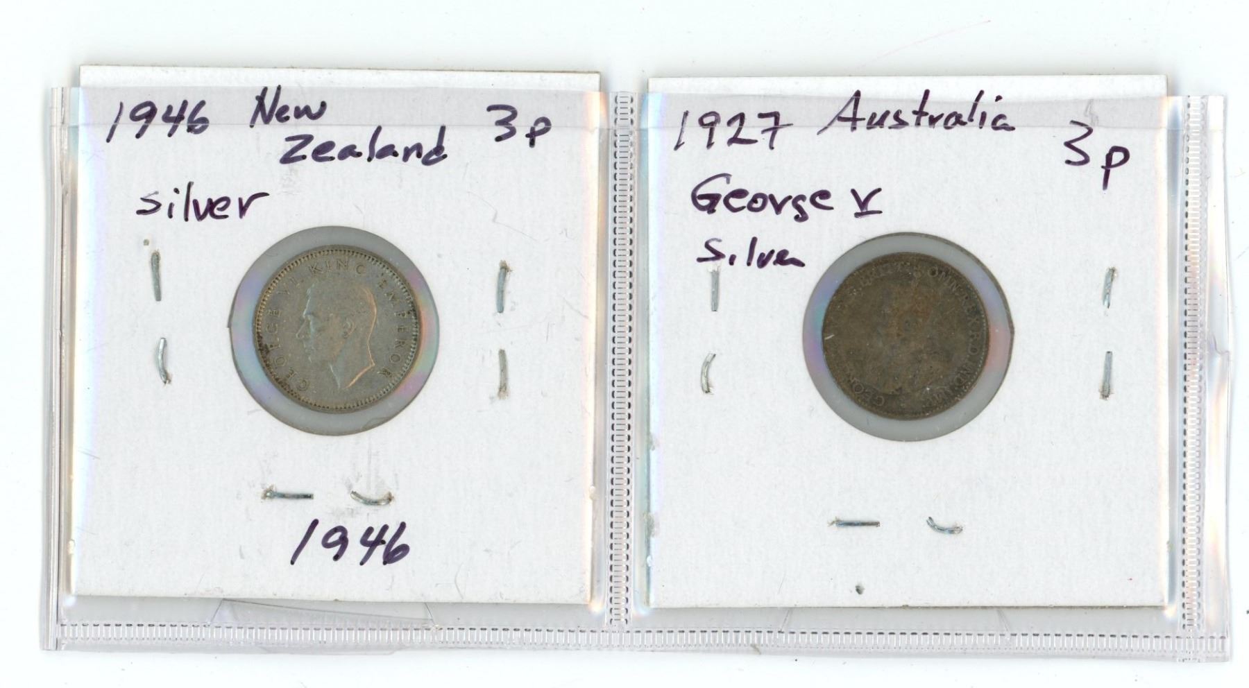 Lot of 2 silver coins: australia 1927 threepence (king George) and new zealand 1946 threepence 3d(king george VI)