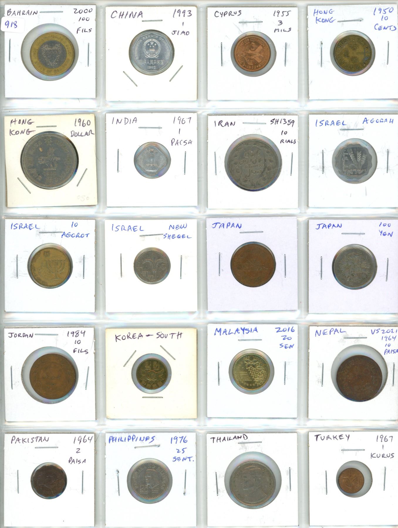 Lot of 20 Asian coins. Includes Bahrain, China, Cyprus, Hong Kong, India, Iran, Israel, Japan, Jorda