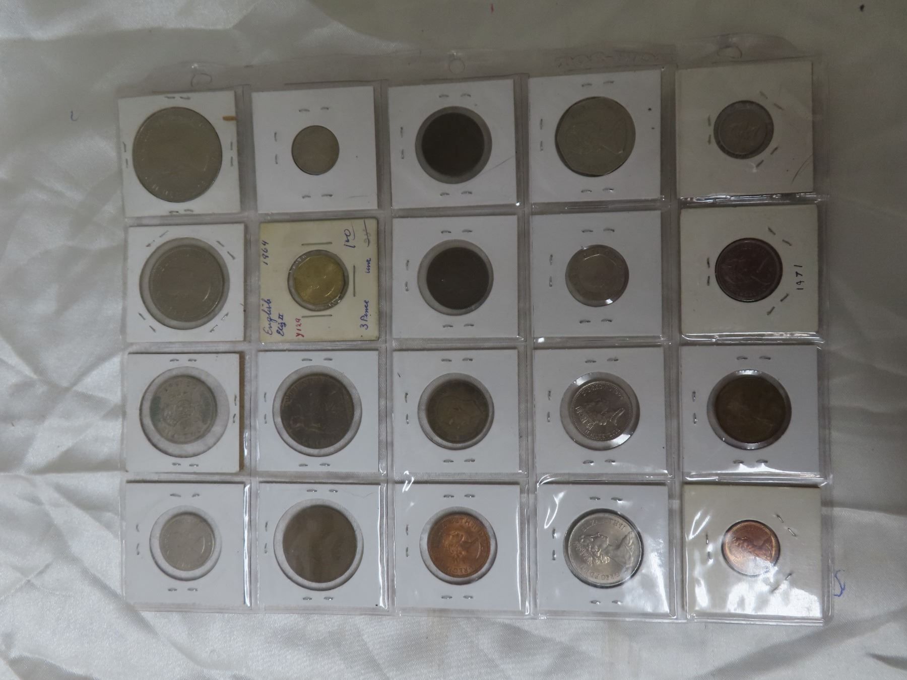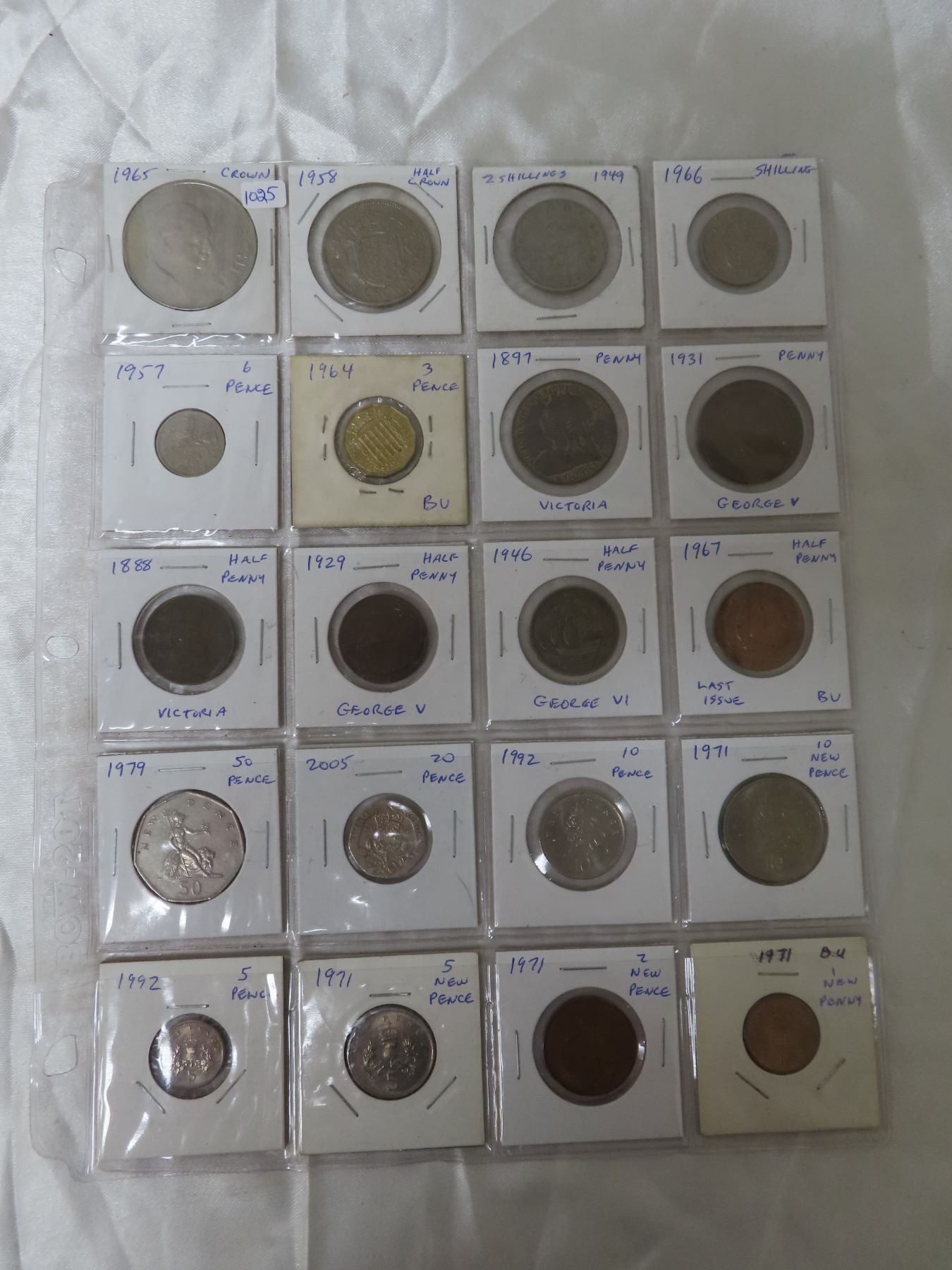 Lot of 20 British coins including Crown, Half Crown, 2 Shillings, Shilling, 6 Pence, 3 Pence, Pennies, & Half Pennies, plus 50 Pence, 20 Pence, 10 Pence, 10 New Pence, 5 Pence, 5 New Pence, 2 New Pence & 1 New Penny.