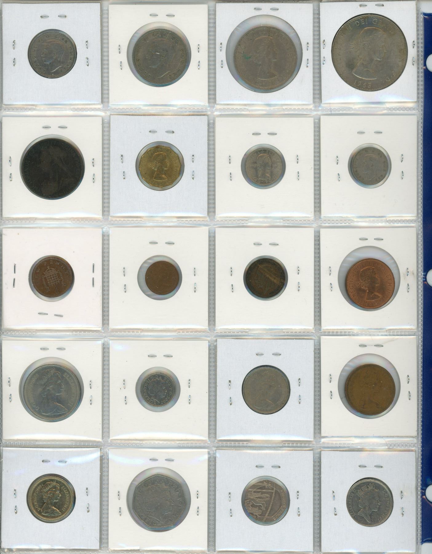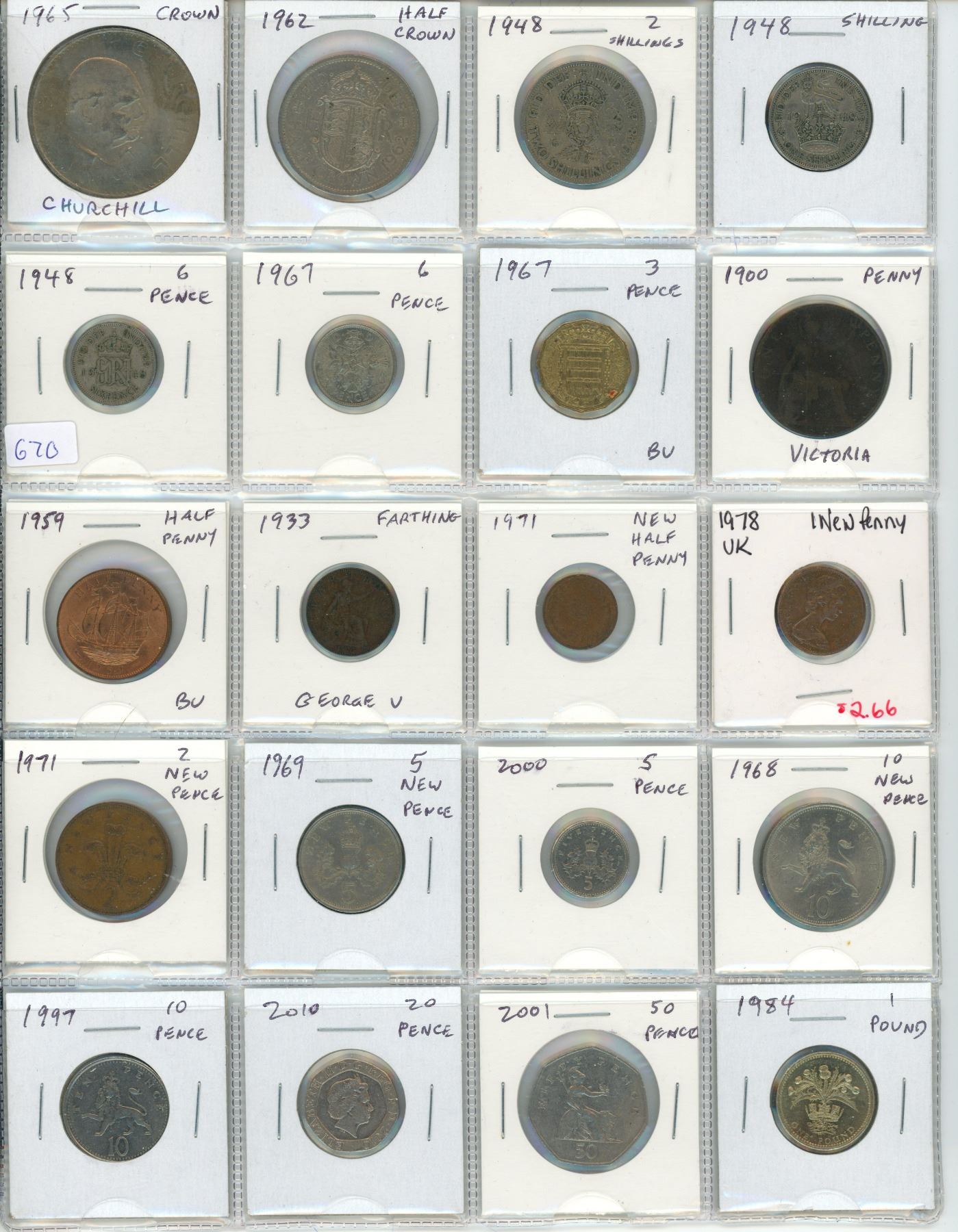 Lot of 20 British coins including Crown, Half Crown, 2 Shillings, Shillings, 6 Pence, 3 Pence, Penny, Half Penny, Farthing, New Half Penny, New Penny, 2 New Pence, 5 New Pence, 5 Pence, 10 New Pence, 10 Pence, 20 Pence, 50 Pence & Pound.