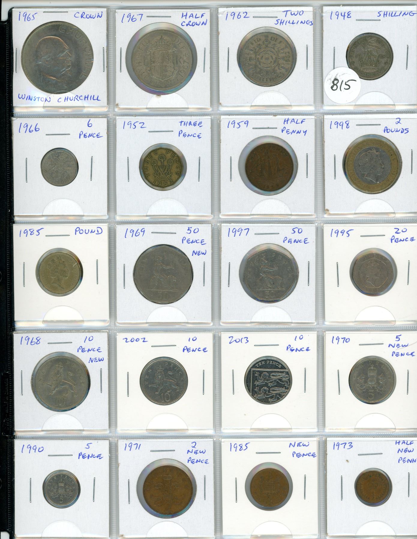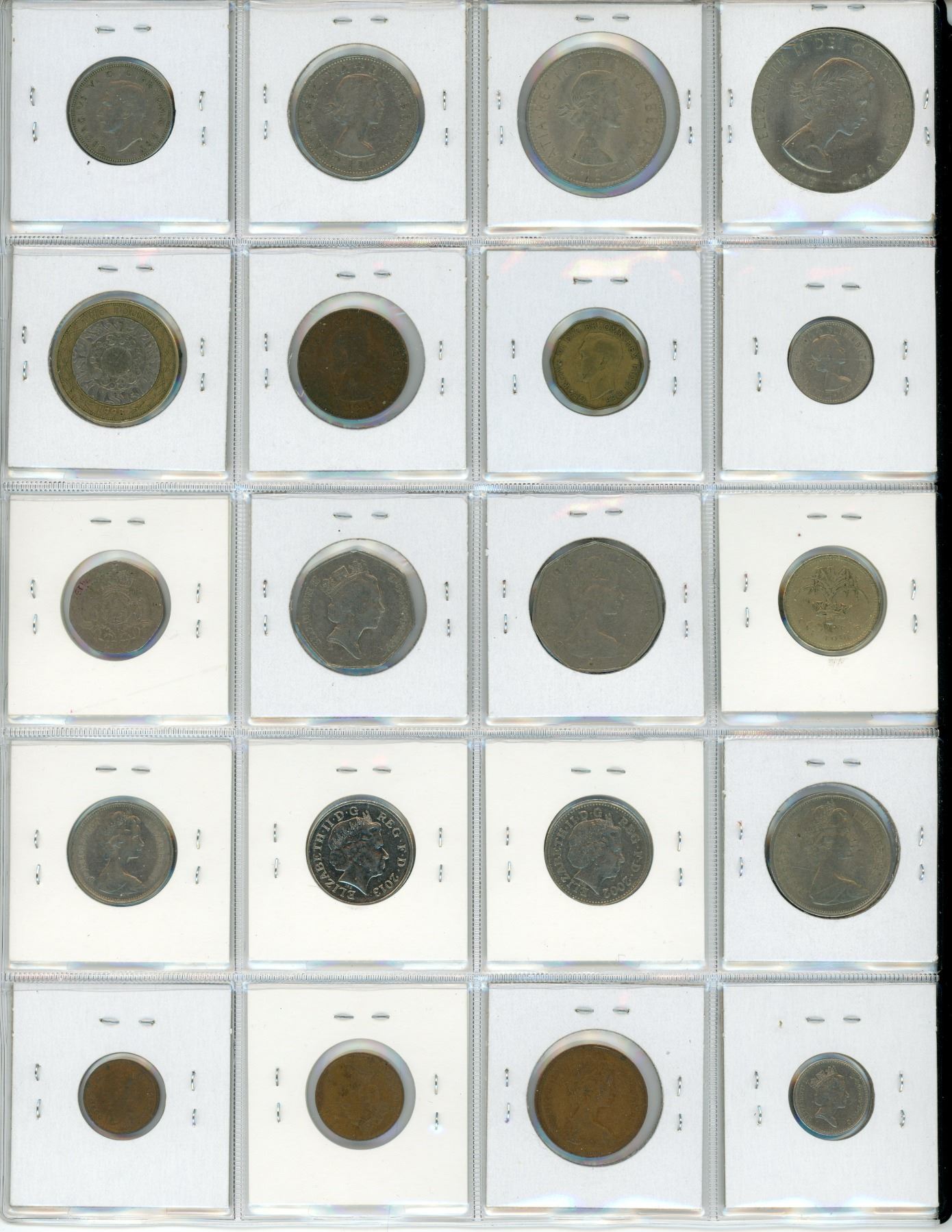 Lot of 20 British coins including Crown, Half Crown, Two Shillings, Shilling, 6 Pence, 3 Pence, Half Penny, 2 Pounds, Pound, 50 New Pence, 50 Pence, 20 Pence, 10 New Pence, 10 Pence, 5 New Pence, 5 Pence, 2 New Pence, New Pence & Half New Penny.