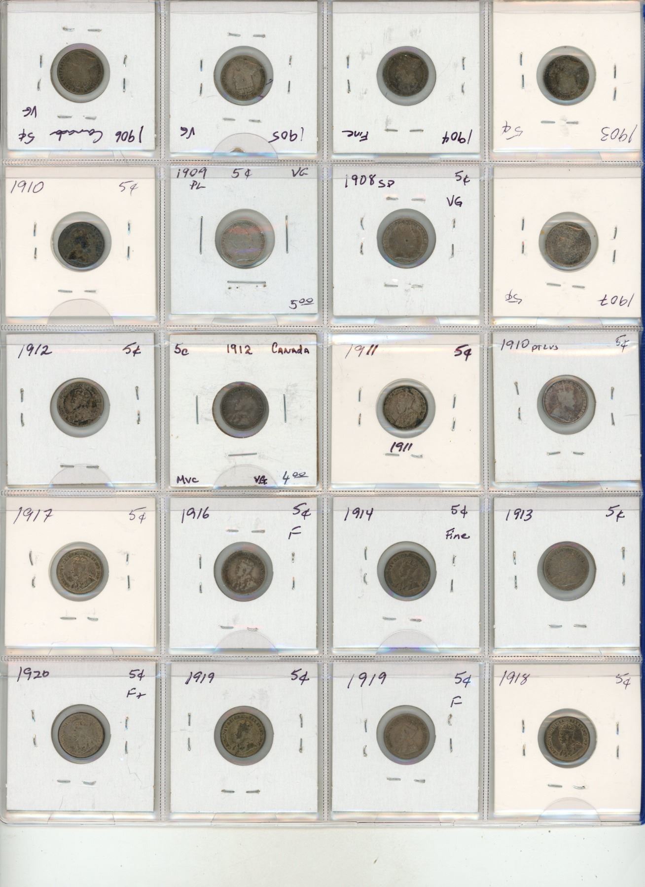 Lot of 20 Canada Silver 5¢: 1903-1909, 1910 (x2), 1911, 1912 (x2), 1913-14, 1916-18, 1919 (x2), 192
