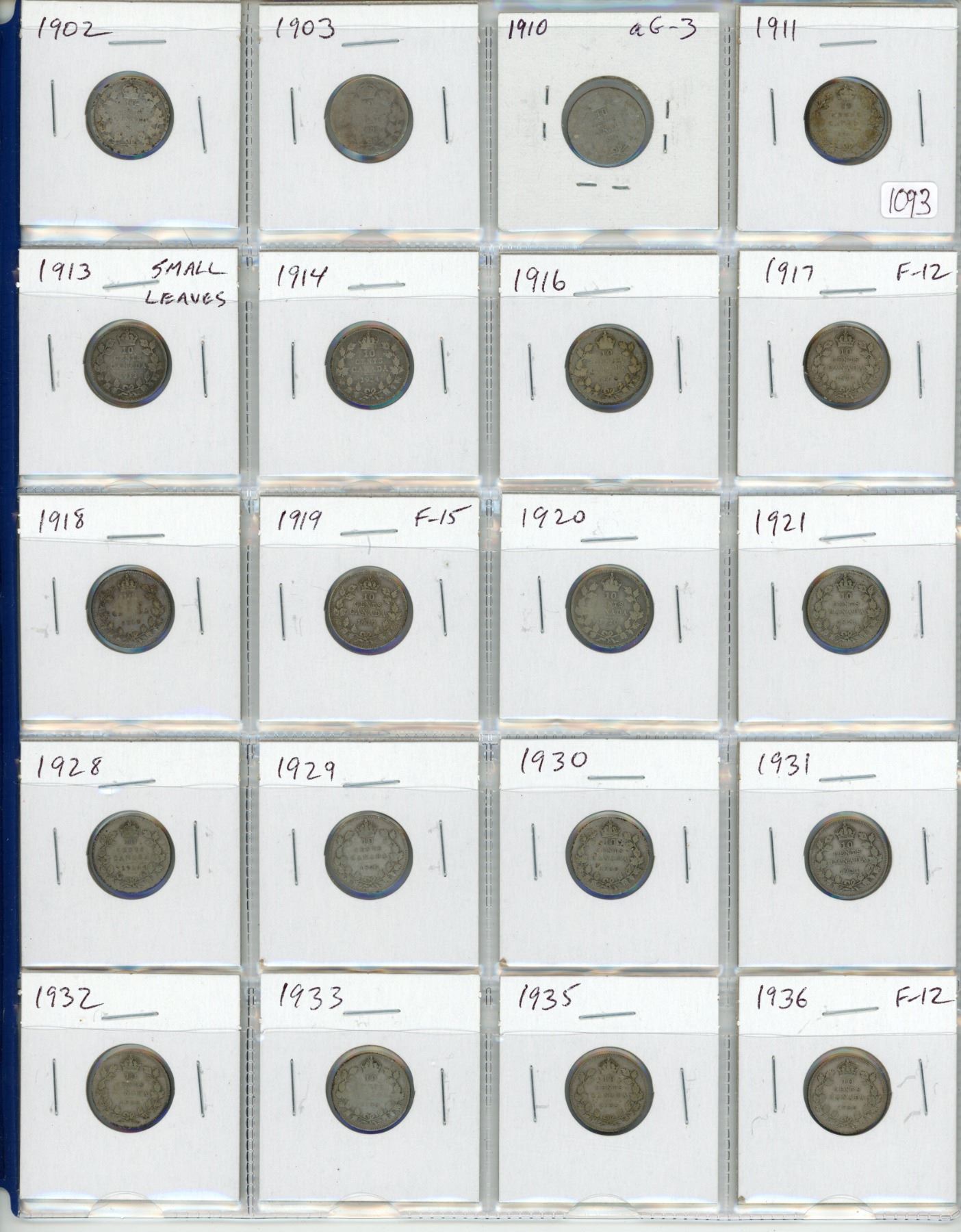 Lot of 20 Canadian Edward VII & George V Silver 10 Cents. Includes 1902, 1903, 1910, 1911, 1913 Small Leaves, 1914, 1916, 1917, 1918, 1919, 1920, 1921, 1928, 1929, 1930, 1931, 1932, 1933, 1935 & 1936. Coins grade up to F-15.