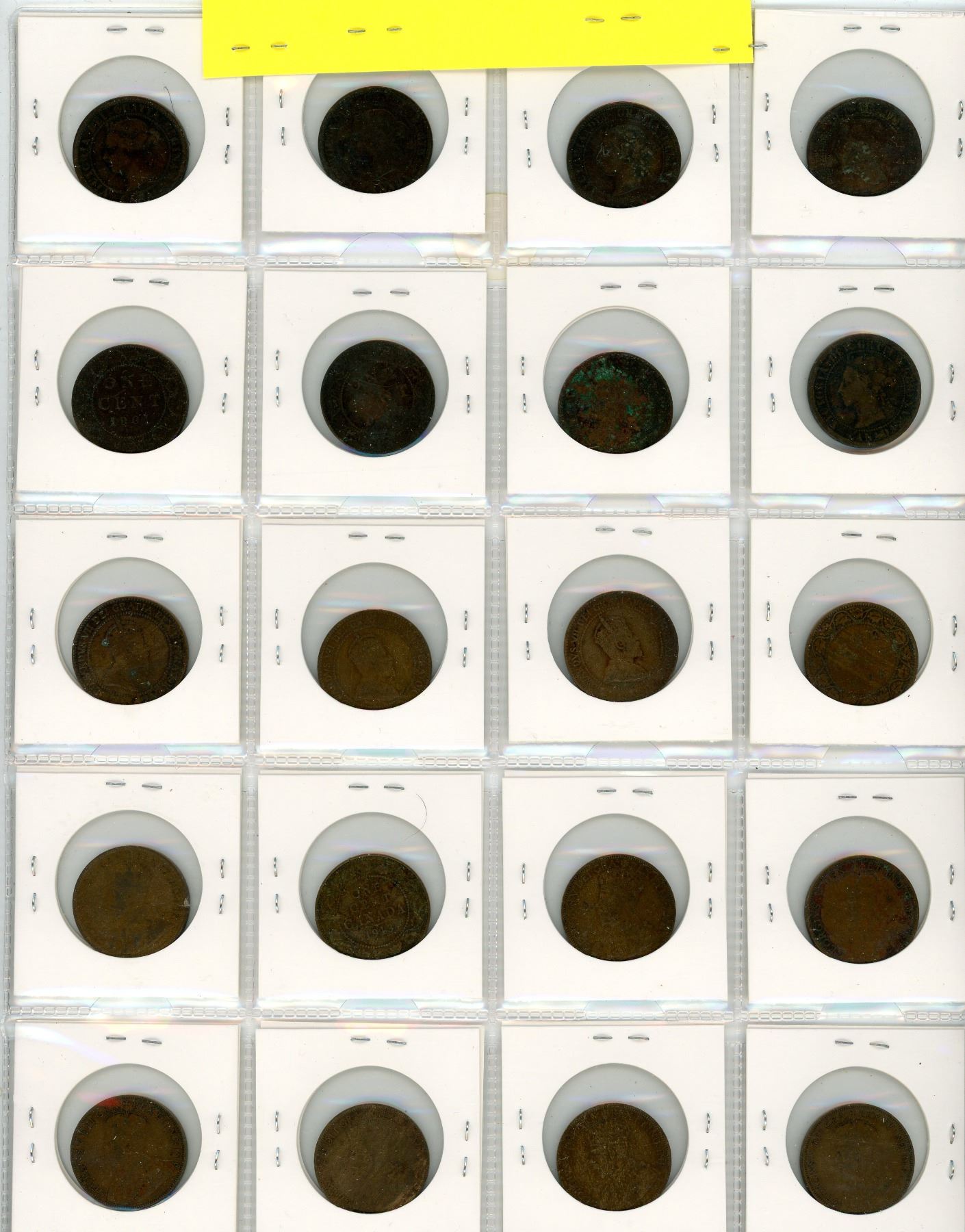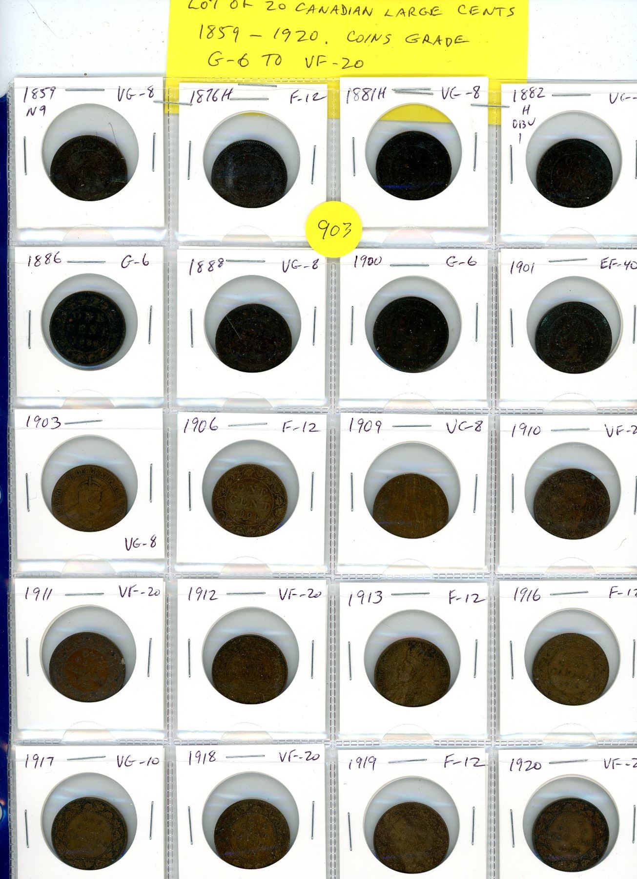 Lot of 20 Canadian Large Cents 1859 – 1920. Includes 1859 N9, 1876H. 1881H, 1882H Obv 1, 1886, 1888, 1900, 1901, 1903, 1906, 1909, 1910, 1911. 1912. 1913. 1916, 1917, 1918, 1919, 1920. Coins graded G-6 to VF-20.