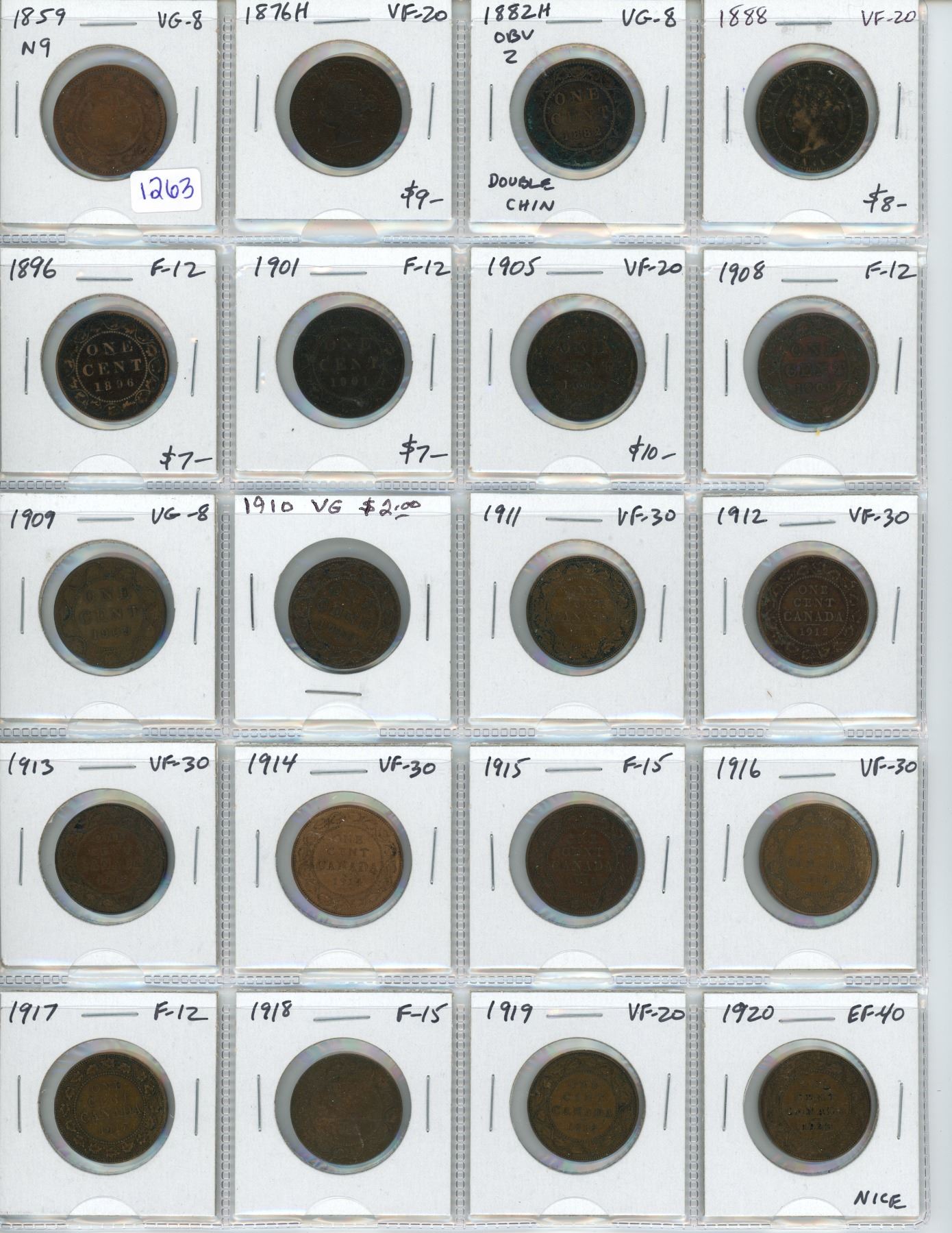 Lot of 20 Canadian Large Cents: 1859 Narrow 9, 1876H, 1882H Obverse 2 (Double Chin), 1888, 1896, 1901, 1905, 1908, 1909, 1910, 1911, 1912, 1913, 1914, 1915, 1916, 1917, 1918, 1919 & 1920. Coins grade VG-8 to EF-40. A nice selection.