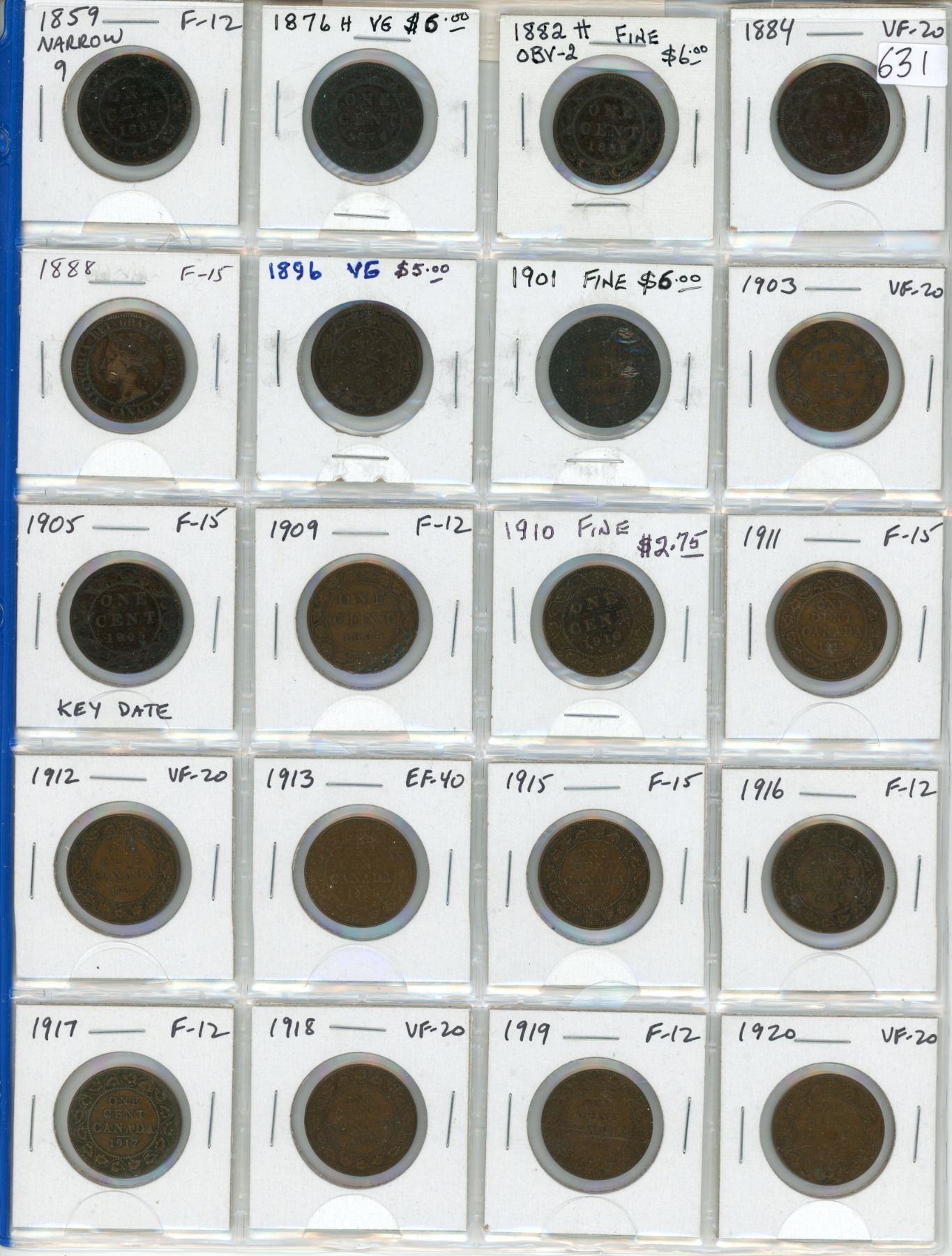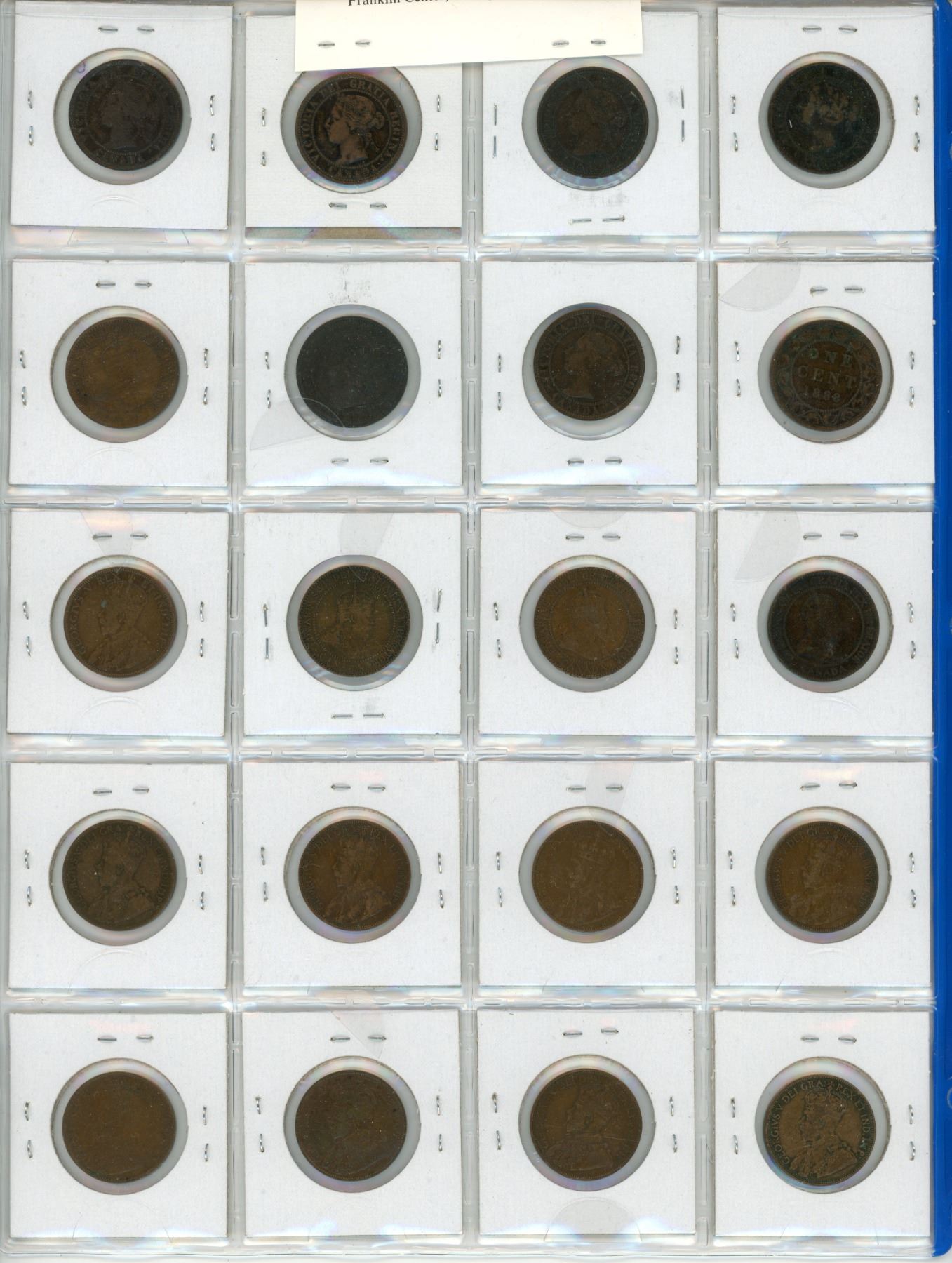 Lot of 20 Canadian Large Cents: Includes 1859 Narrow 9, 1876H, 1882H Obverse 2 (Double Chin), 1884, 1888, 1896, 1901, 1903, 1905, 1909, 1910, 1911, 1912, 1913, 1915, 1916, 1917, 1918, 1919 & 1920. Coins grade VG-8 to EF-40. A nice selection.
