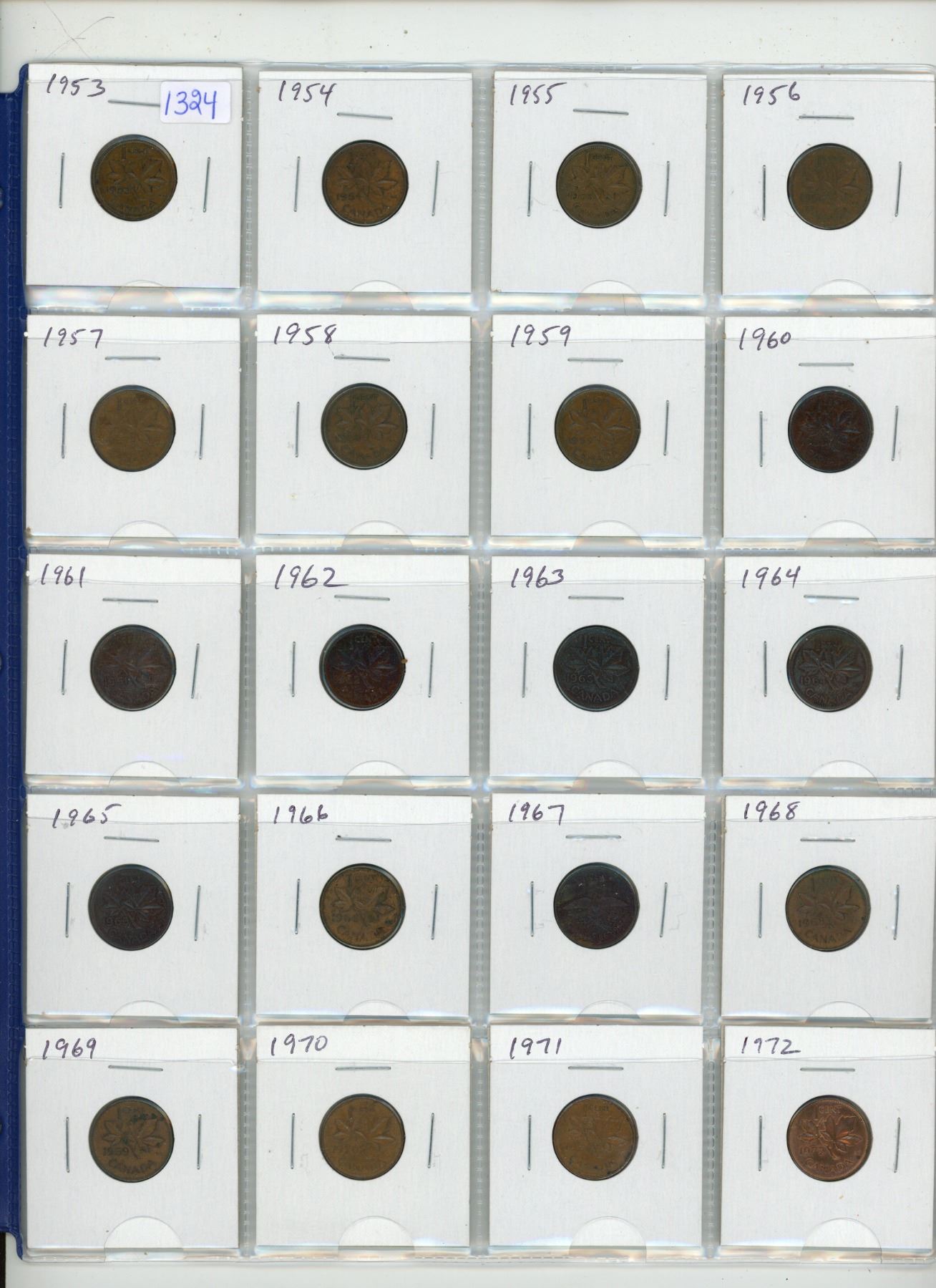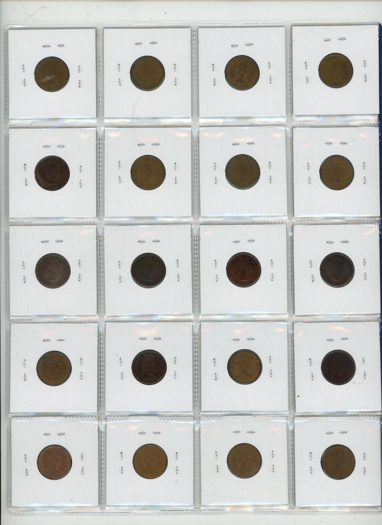 Lot of 20 Canadian Queen Elizabeth Small Cents. Dates include 1953, 1954, 1955, 1956, 1957, 1958, 1959, 1960, 1961, 1962, 1963, 1964, 1965, 1966, 1967, 1968, 1969, 1970, 1971 & 1972. Coins grade VF - AU.