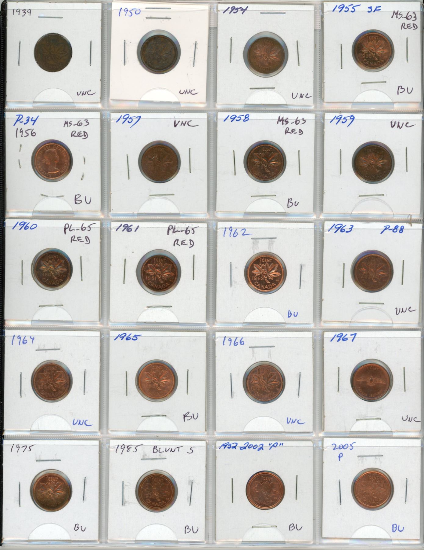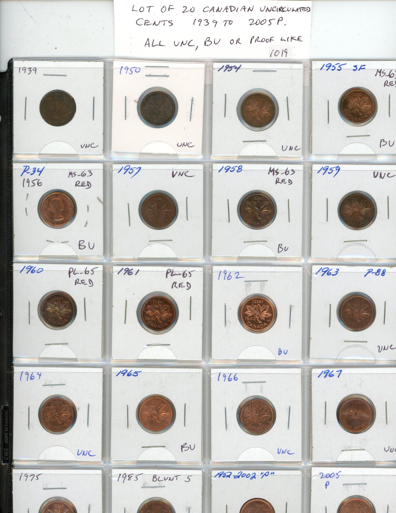 Lot of 20 Canadian Uncirculated Cents from 1939 to 2005P. All Unc, BU or Proof Like.