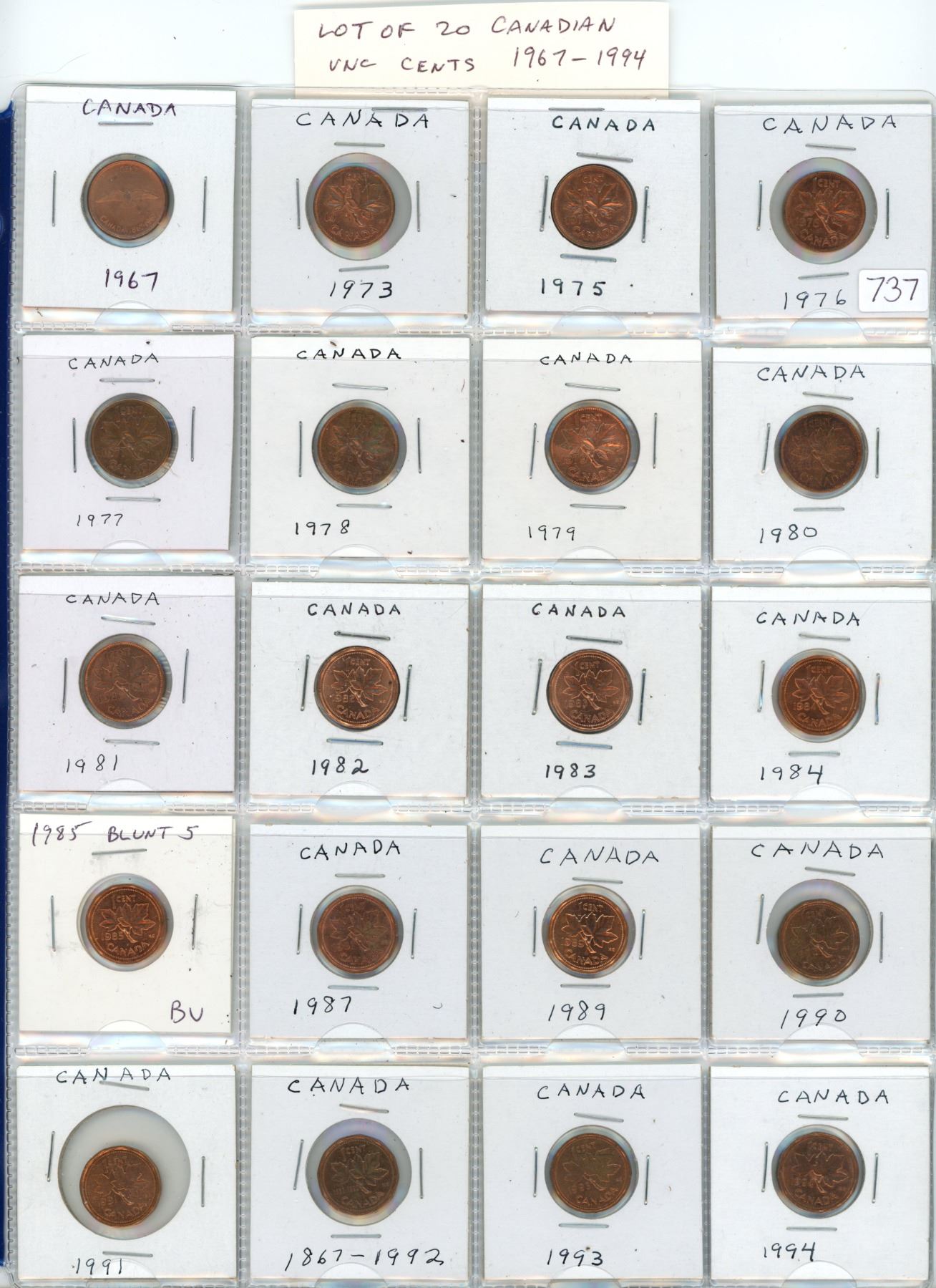 Lot of 20 Canadian Uncirculated Small Cents. Includes 1967, 1973, 1975, 1976, 1977, 1978, 1979, 1980, 1981, 1982, 1983, 1984, 1985 Blunt 5, 1987, 1989, 1990, 1991, 1992, 1993 & 1994.