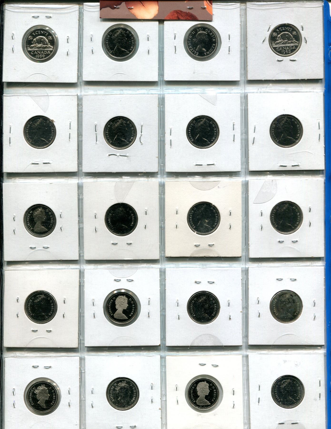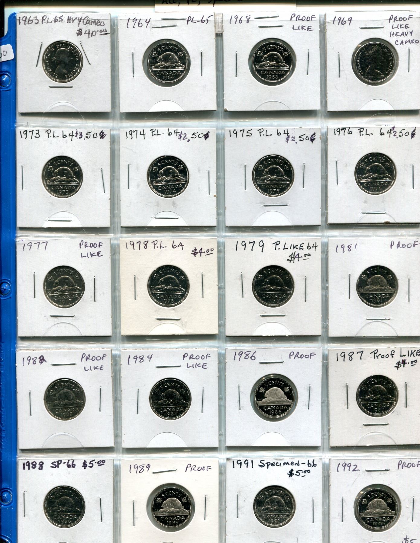 Lot of 20 Collector Nickel 5 Cents 1963 to 1992. Includes 1963, 1964, 1968, 1969, 1973, 1974, 1975, 1976, 1977, 1978, 1979, 1981, 1982, 1984, 1986, 1987, 1988, 1989, 1991 & 1992. All coins Proof Like (some with Heavy Cameos), Specimen or Proof with Ultra Heavy Cameos. A nice selection.