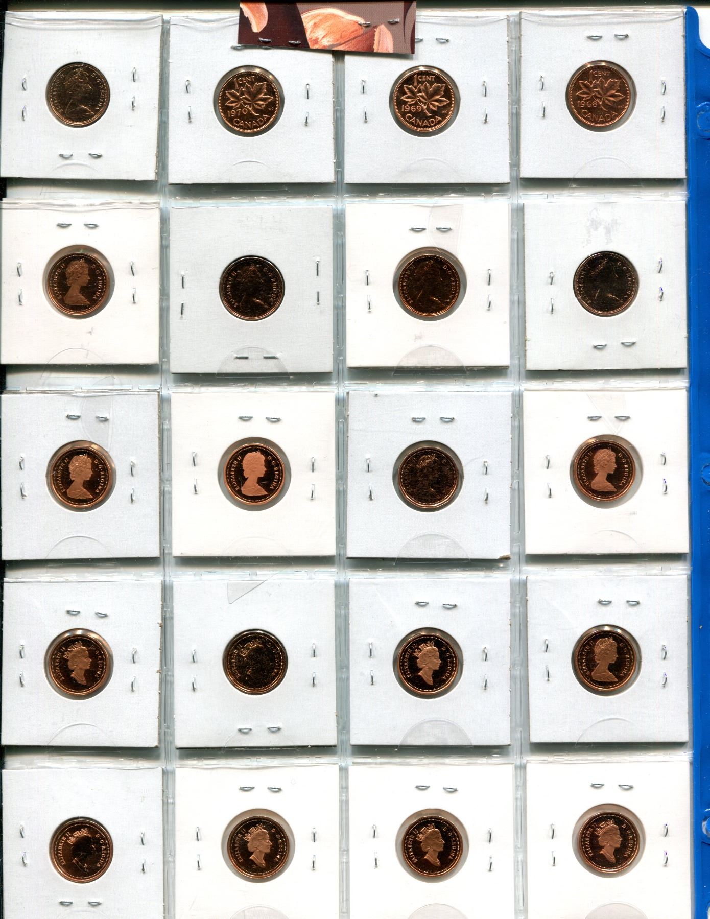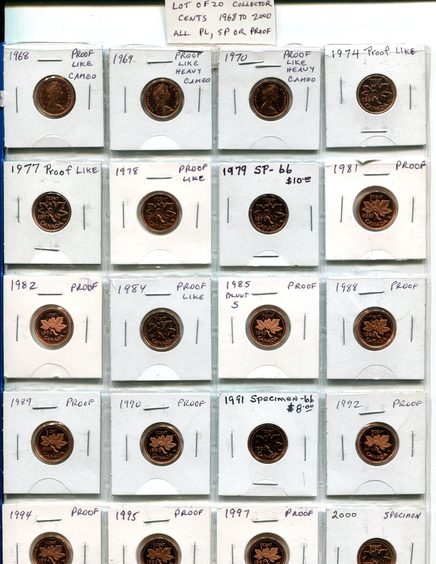 Lot of 20 Collector Small Cents 1968 to 2000. Includes 1968, 1969, 1970, 1974, 1977, 1978, 1979, 1981, 1982, 1984, 1985 Blunt 5, 1988, 1989, 1990, 1991, 1992, 1994, 1995, 1997 & 2000. All coins Proof Like (some with Cameos & Heavy Cameos), Specimen and Proof with Ultra Heavy Cameos. A nice selection.