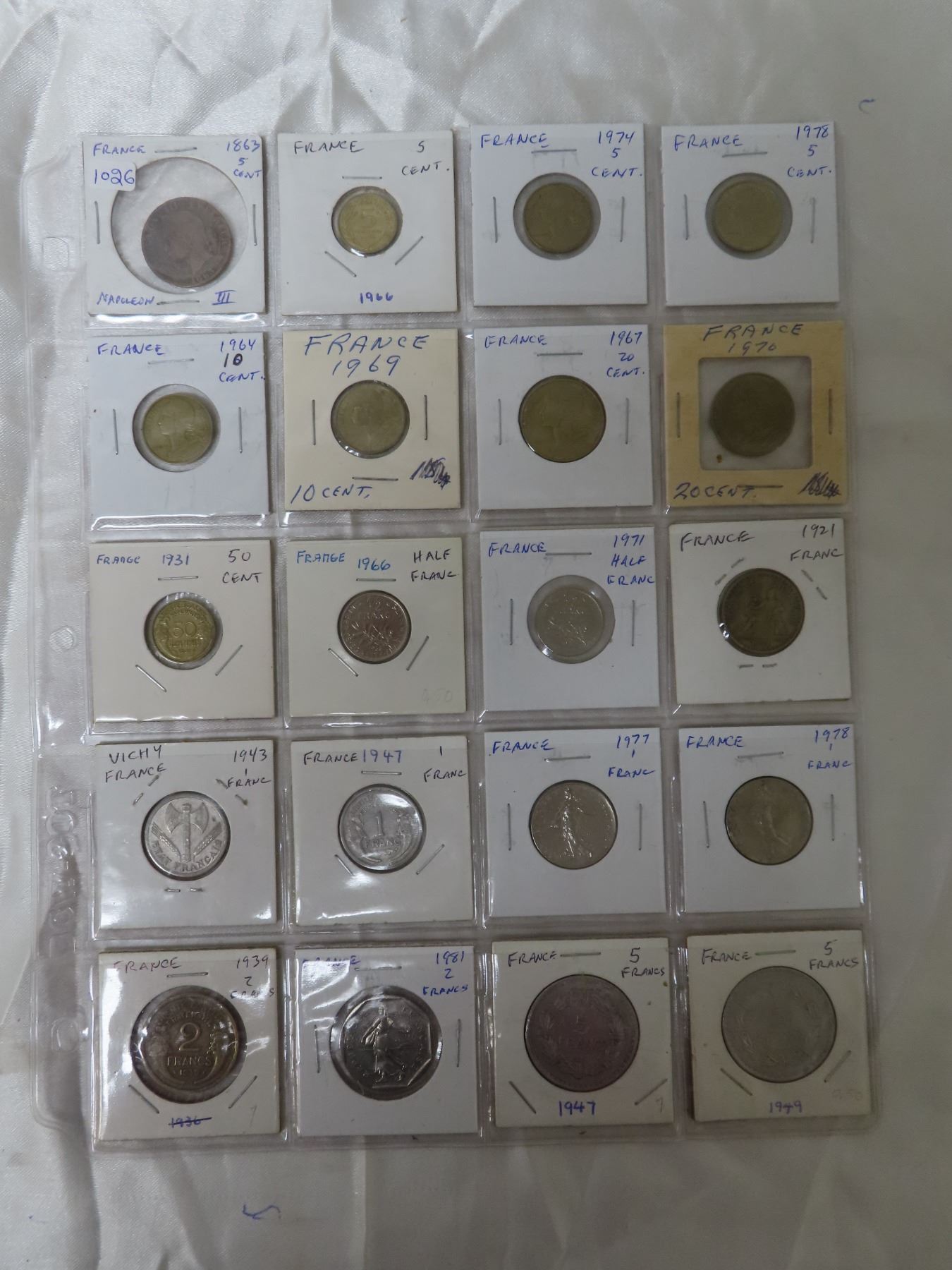 Lot of 20 French coins including 1863 Emperor Napoleon III 5 Centimes.