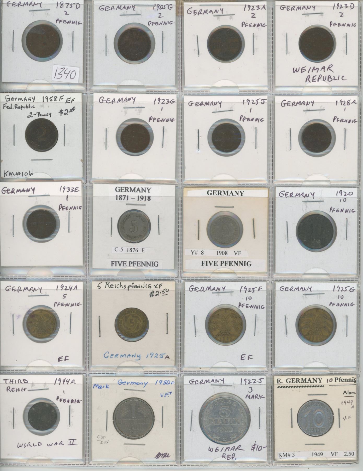 Lot of 20 German coins including German Empire 1875D 2 pfennig, Weimar Republic including 1922J 3 Mark, Nazi Third Reich, Federal Republic & East Germany. A nice selection.