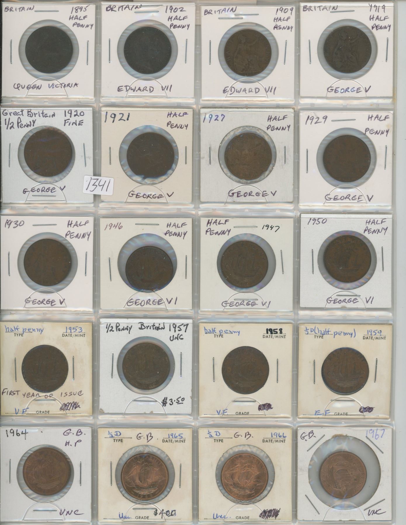 Lot of 20 Great Britain Half Pennies 1895 – 1967. Includes all monarchs including Queen Victoria, Edward VII, George V, George VI & Elizabeth. 5 coins are Unc.