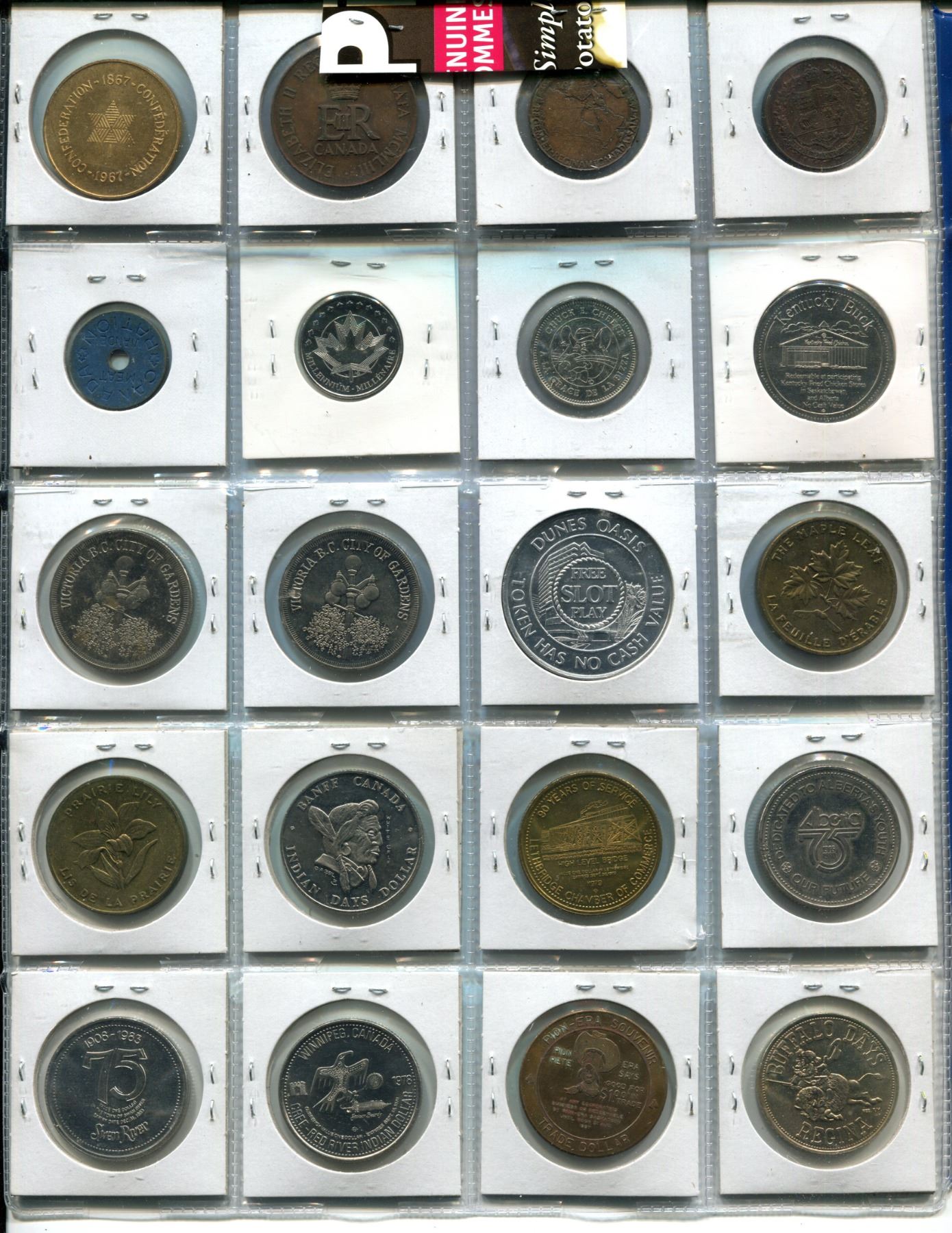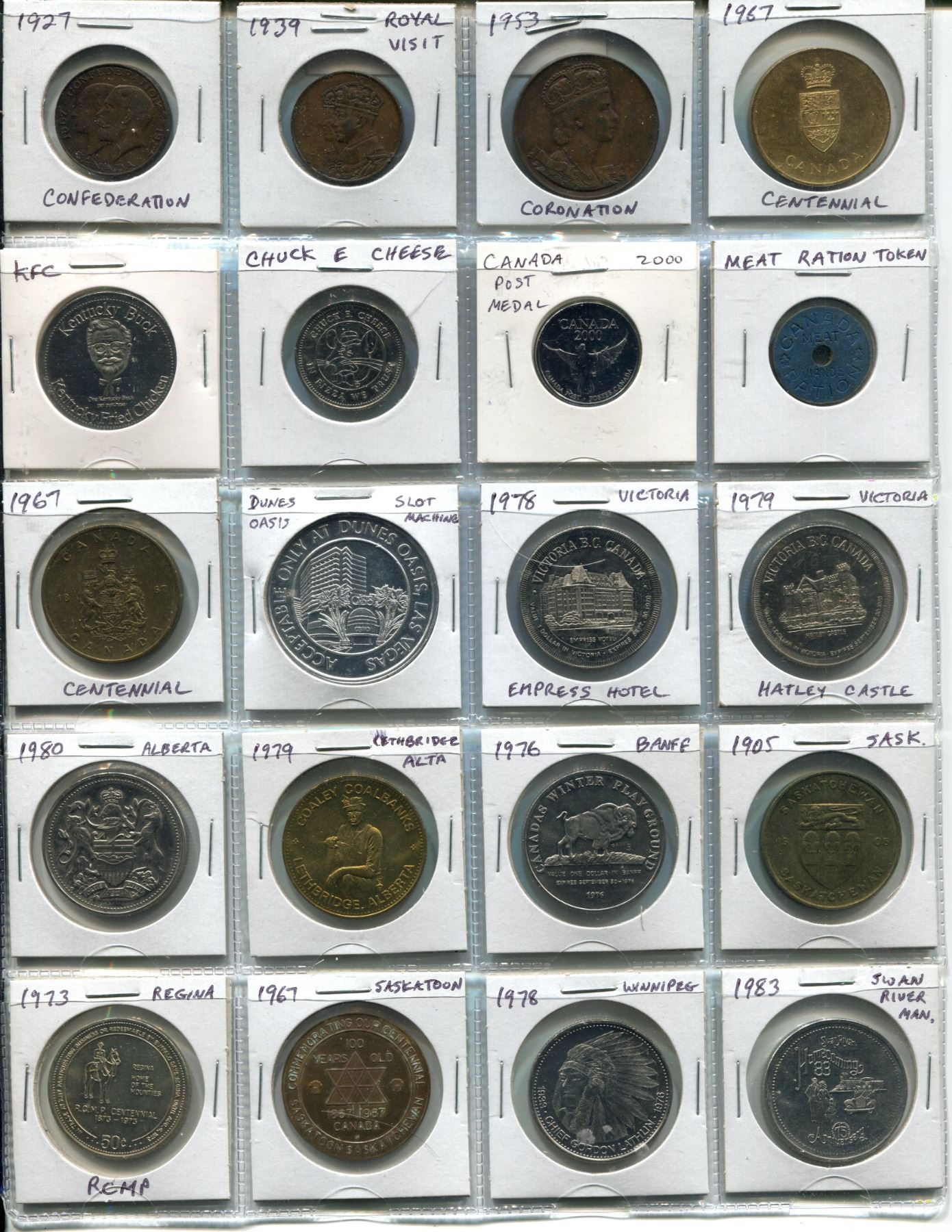 Lot of 20 Medals, Trade Dollar & Tokens. Includes 1927 Confederation, 1939 Royal Visit, 1953 Coronation, 1967 Centennial, KFC, Chuck E Cheese, Canada Post, Meat Ration, Casino, BC, Alberta, Saskatchewan & Manitoba.