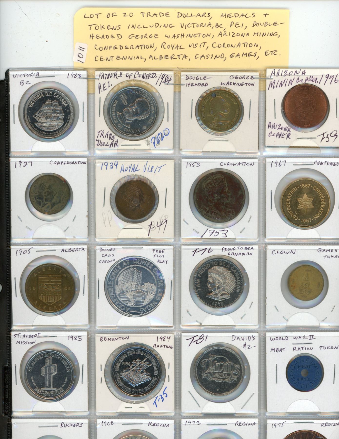 Lot of 20 Trade Dollars, Medals & Tokens including Victoria BC, PEI, Double Headed George Washington, Arizona Mining, Confederation, Royal Visit, Coronation, Centennial Alberta, Casino & Games Tokens.
