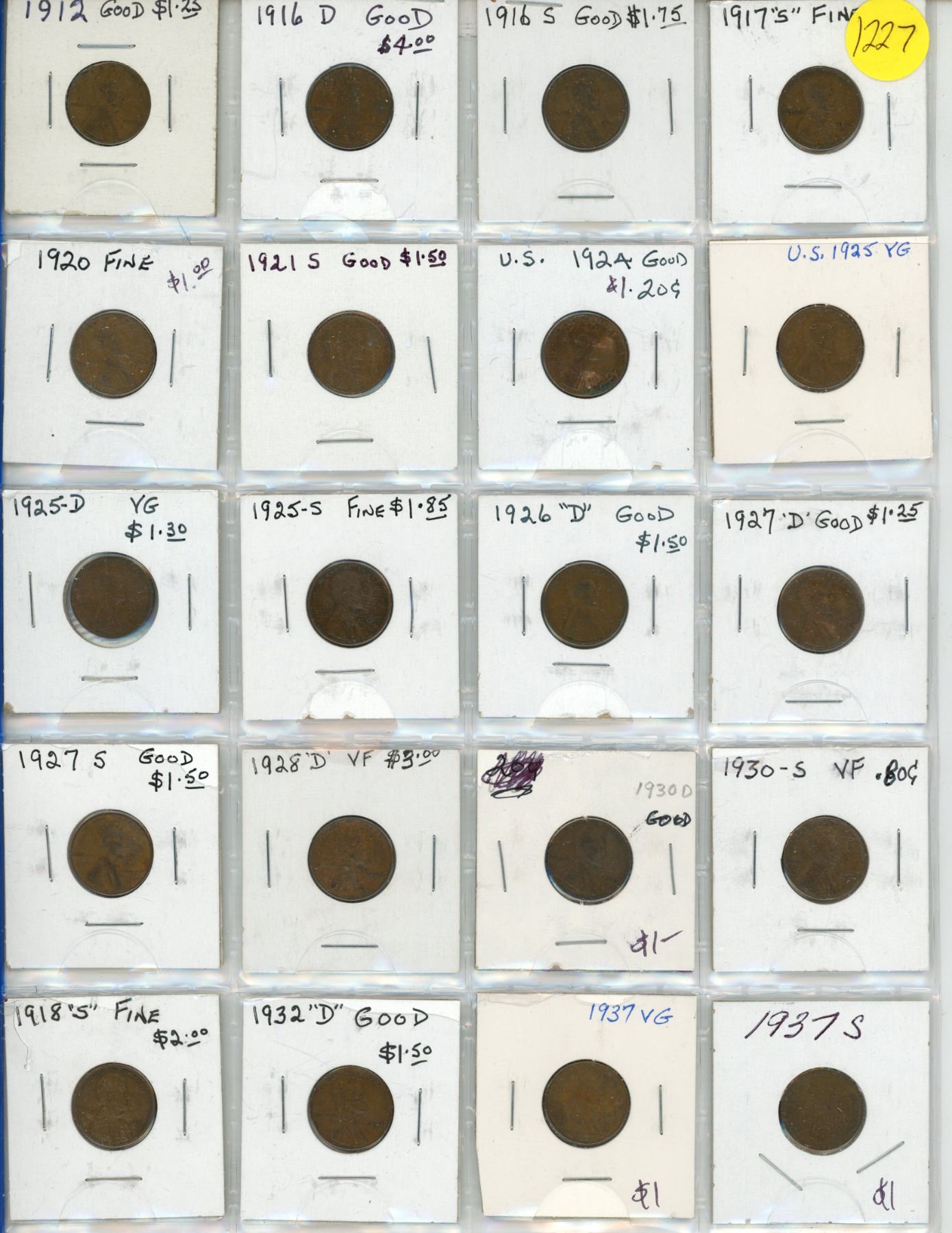 Lot of 20 U.S. Lincoln Wheat cents 1912 to 1937S. Includes 1912, 1916D, 1916S, 1917S, 1918S, 1920, 1