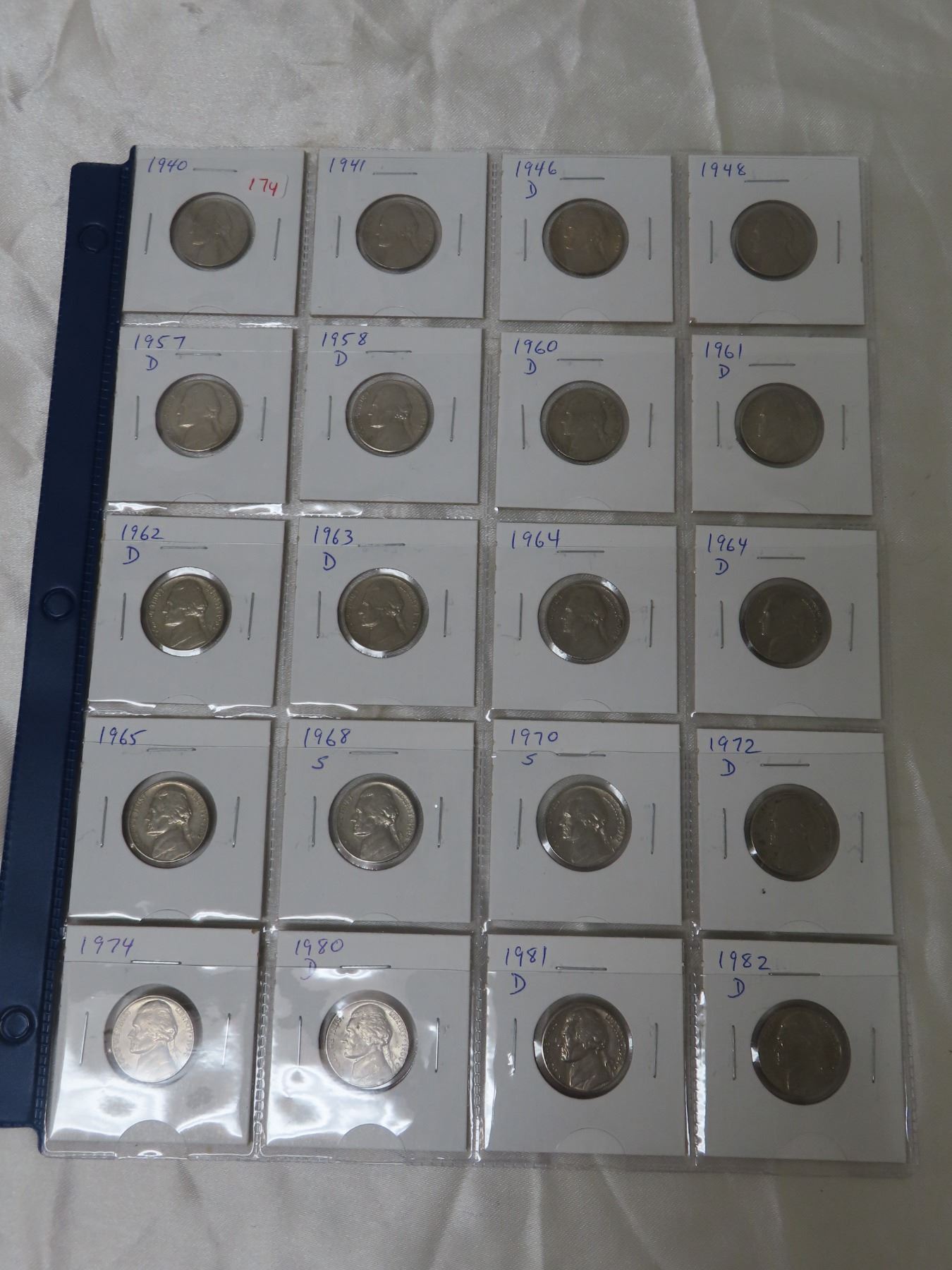 Lot of 20 U.S. Thomas Jefferson Nickels. Dates include 1940, 1941, 1946D, 1948, 1957D, 1958D, 1960D, 1961D, 1962D, 1963D, 1964, 1964D, 1965, 1968S, 1970S, 1972D, 1974, 1980D, 1981D & 1982D.