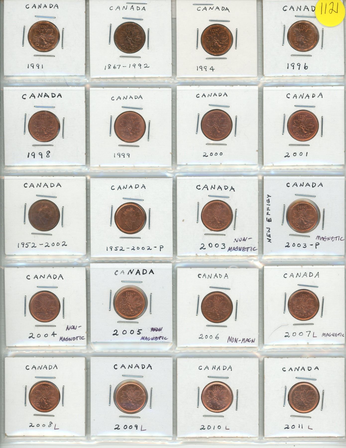 Lot of 20 Uncirculated Canadian Small Cents. Includes 1991, 1992, 1994, 1996, 1998, 1999, 2000, 2001, 2002, 2002P, 2003 non-magnetic, 2003P magnetic, 2004 non-magnetic, 2005 non-magnetic, 2006 non-magnetic, 2007 logo magnetic, 2008 logo, 2009 logo, 2010 logo & 2011 logo. All are Uncirculated or BU Red. A nice selection.