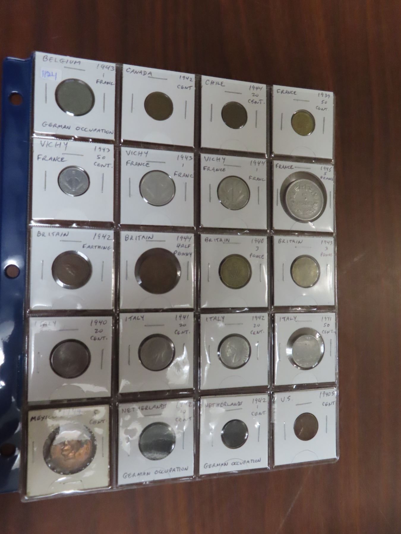 Lot of 20 World War II Coins 1939 - 1945. Includes Belgium under German occupation, Canada, Chile, France, Vichy France, Great Britain, Italy under Mussolini rule, Mexico, Netherlands under German occupation & U.S.A.