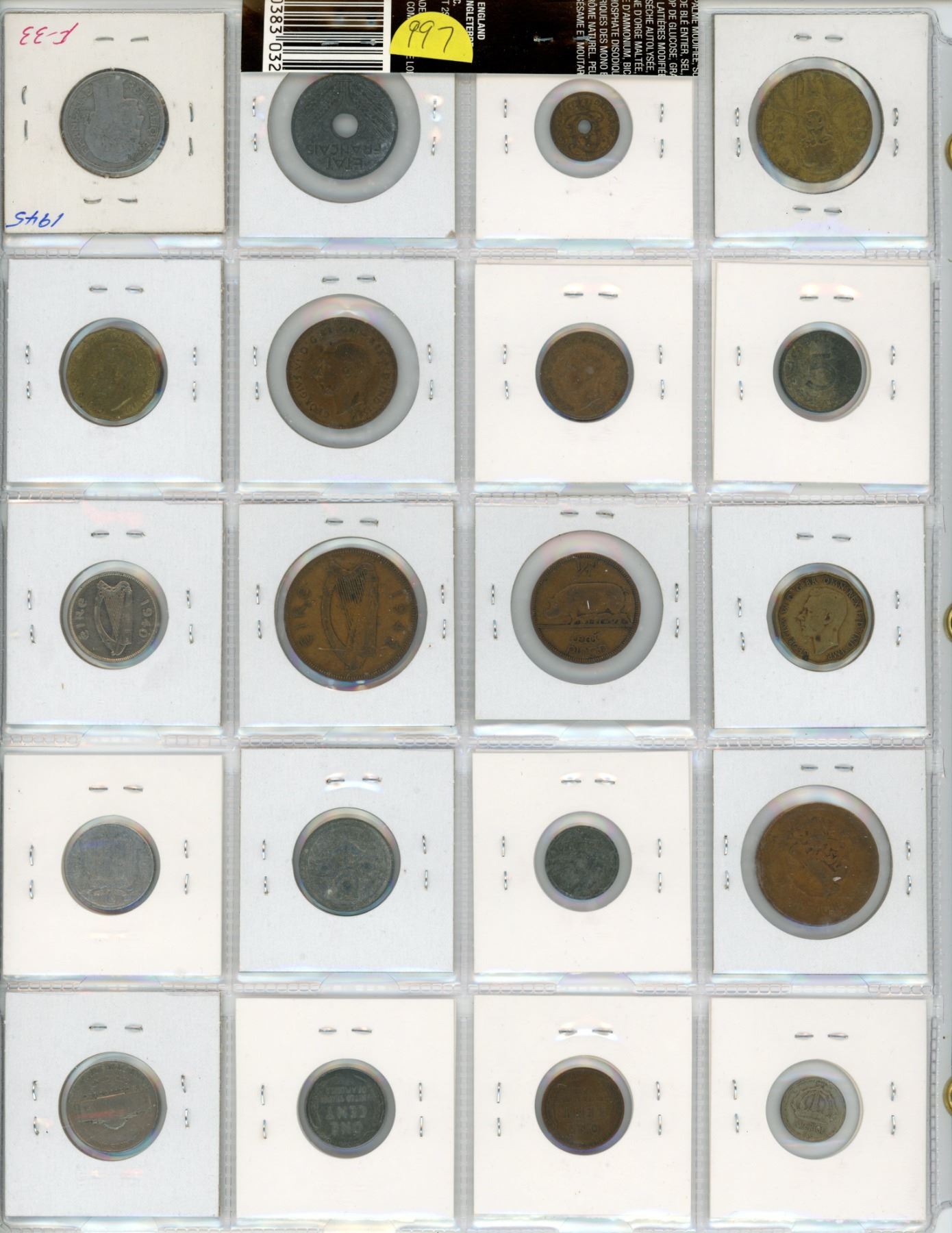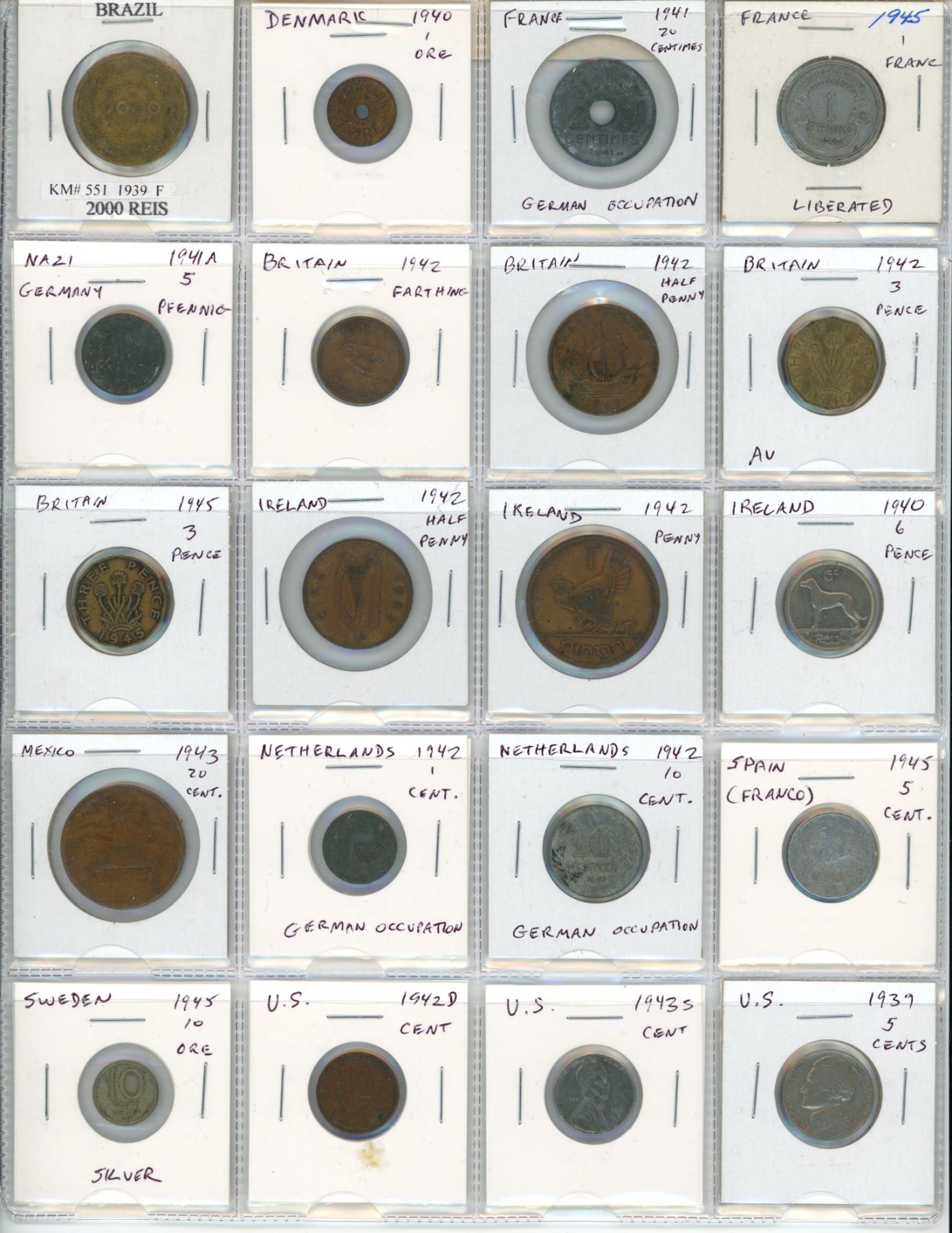 Lot of 20 World War II coins. From Brazil, Denmark under German occupation, France under German occupation, Liberated France, Nazi Germany, Great Britain, Ireland, Mexico, Netherlands under German occupation, Franco Spain, Sweden, and the U.S.