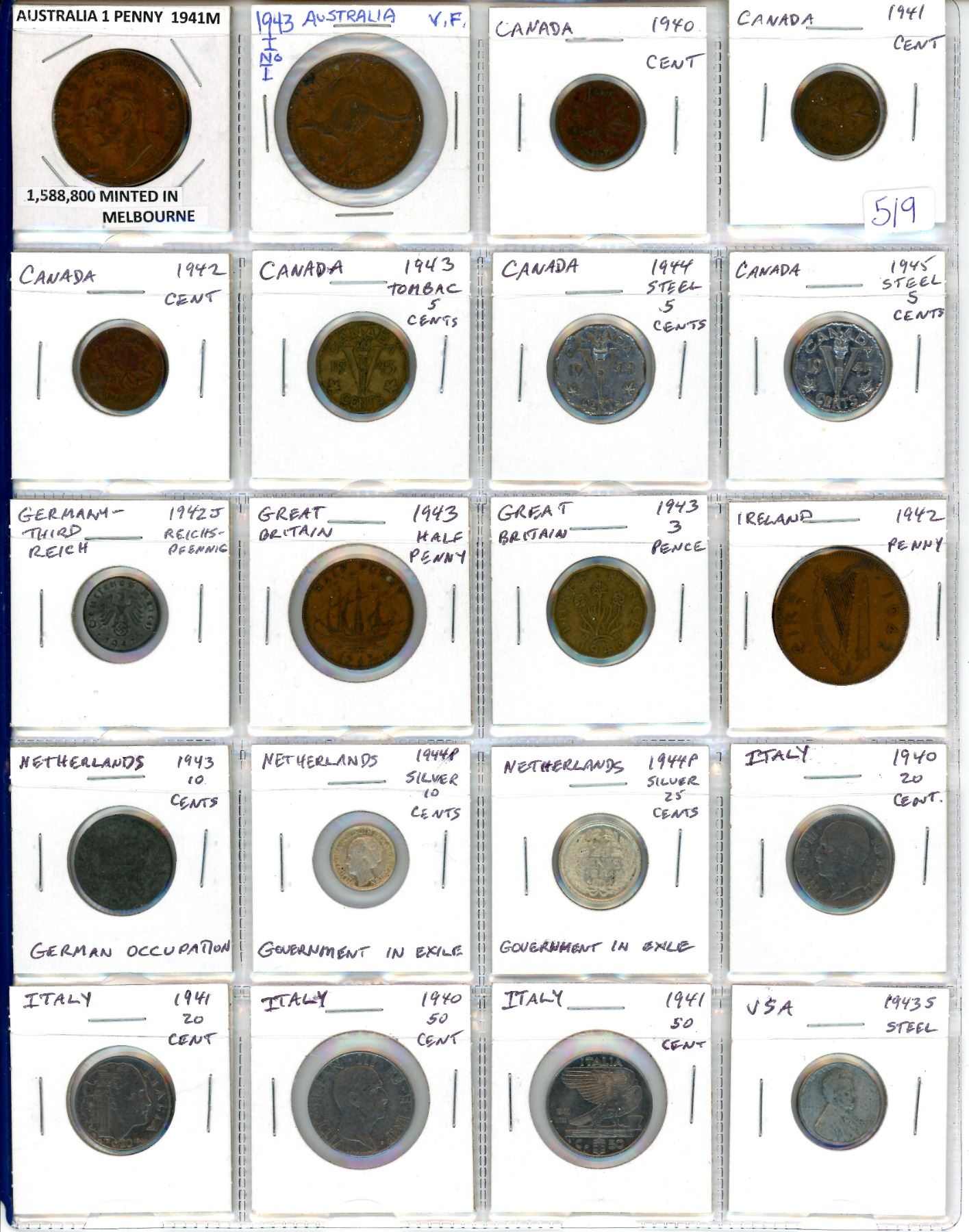 Lot of 20 World War II coins from Australia, Canada, Nazi Germany, Great Britain, Ireland, Netherlands under German occupation, Italy & USA.