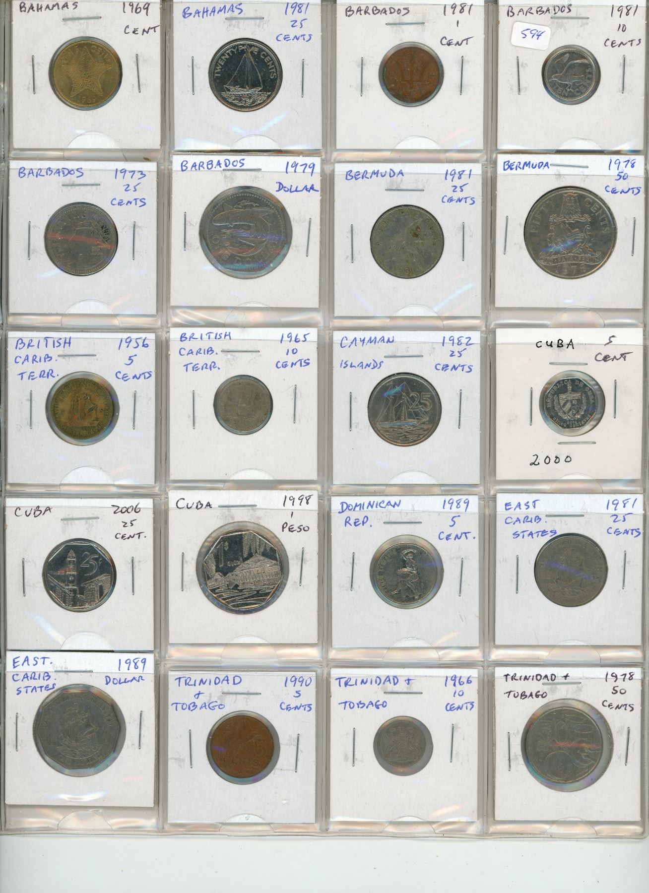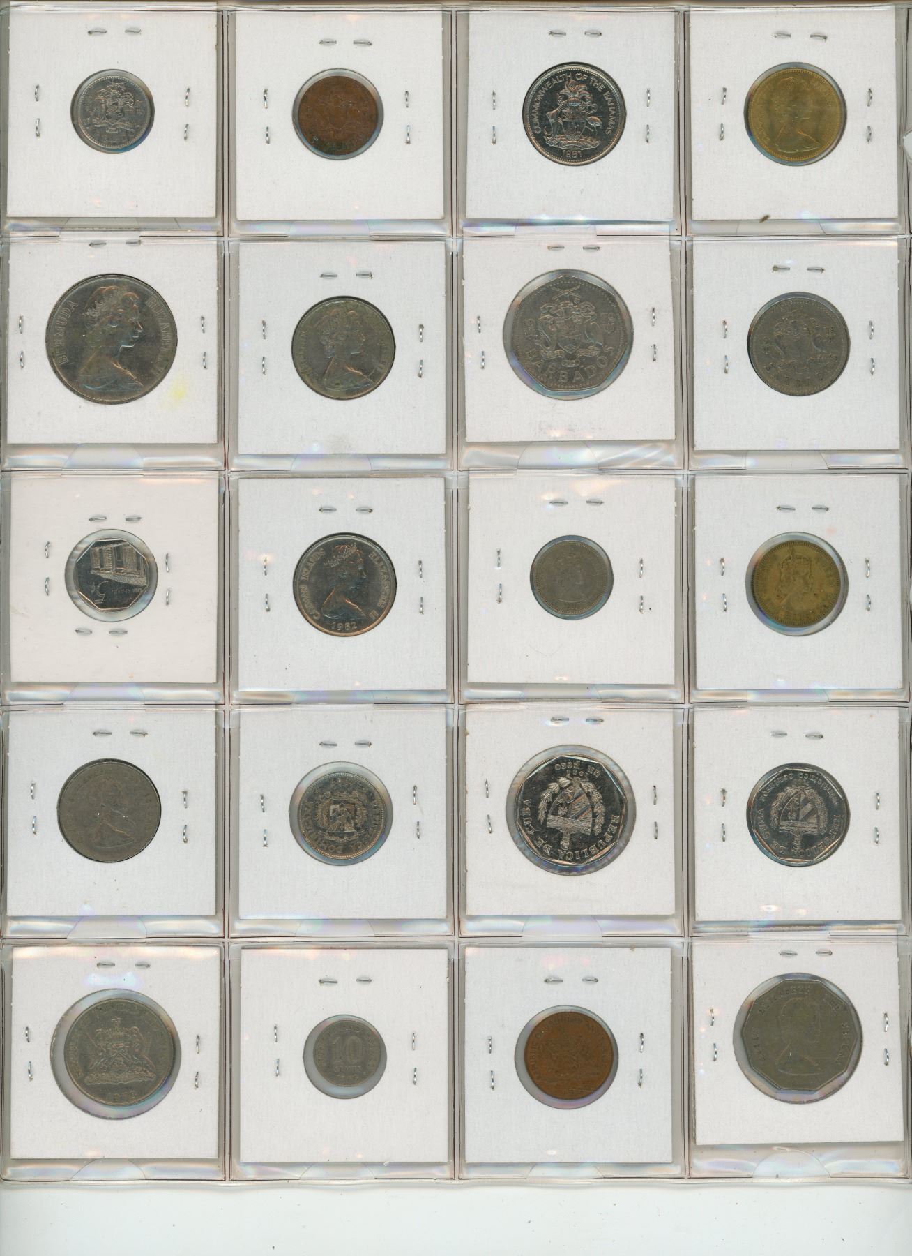 Lot of 20 coins from the Caribbean. Includes Bahamas, Barbados, Bermuda, British Caribbean Territories, Cayman Islands, Cuba, Dominican Republic, East Caribbean States, & Trinidad & Tobago.