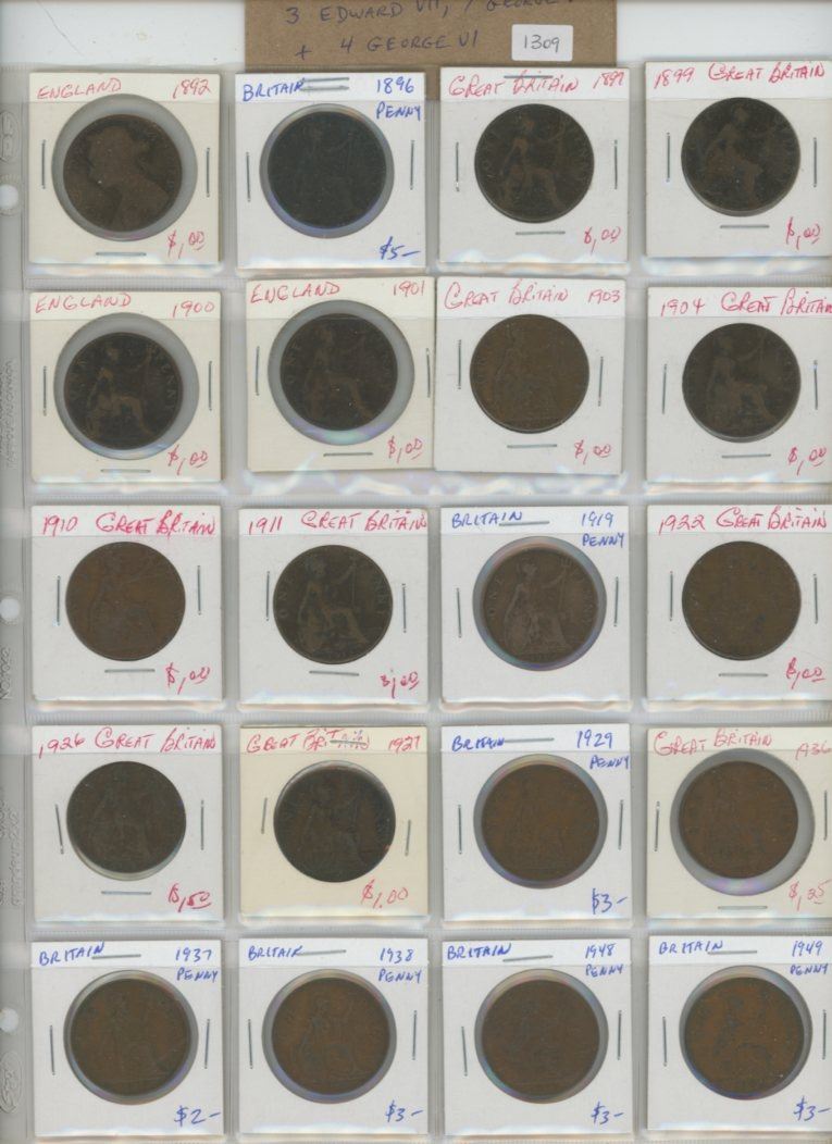 Lot of 20 different British Pennies from 1892 to 1949. Includes 6 Queen Victoria, 3 Edward VII, 7 George V and 4 George VI.