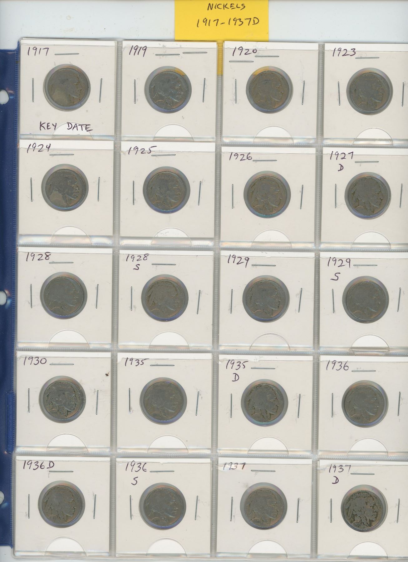 Lot of 20 different U.S. Buffalo Nickels 1917 – 1937D. Includes 1917 Key Date, 1919, 1920, 1923, 1924, 1925, 1926, 1927D, 1928, 1928S, 1929, 1929S, 1930, 1935, 1935D, 1936, 1936D, 1936S, 1937, 1937D.