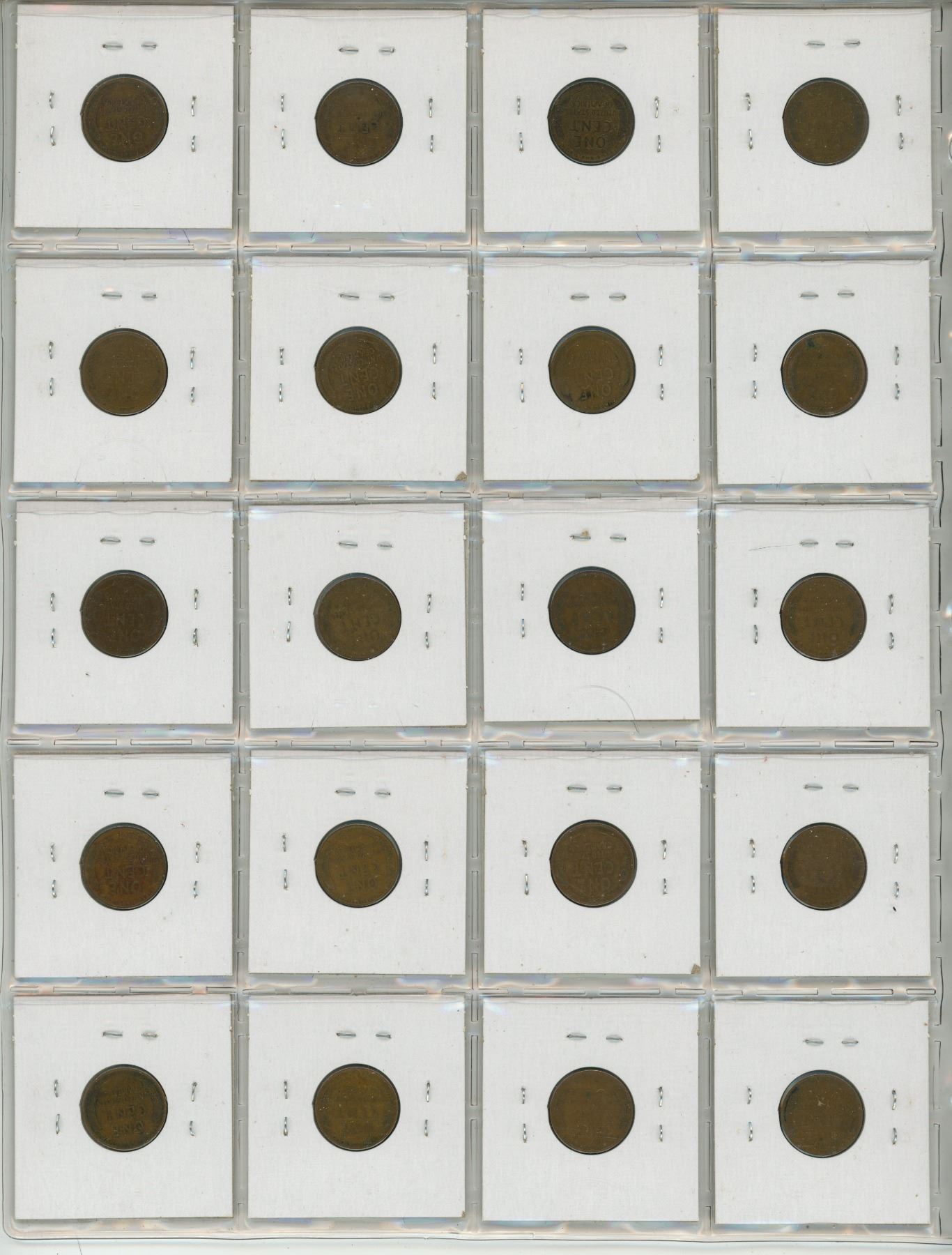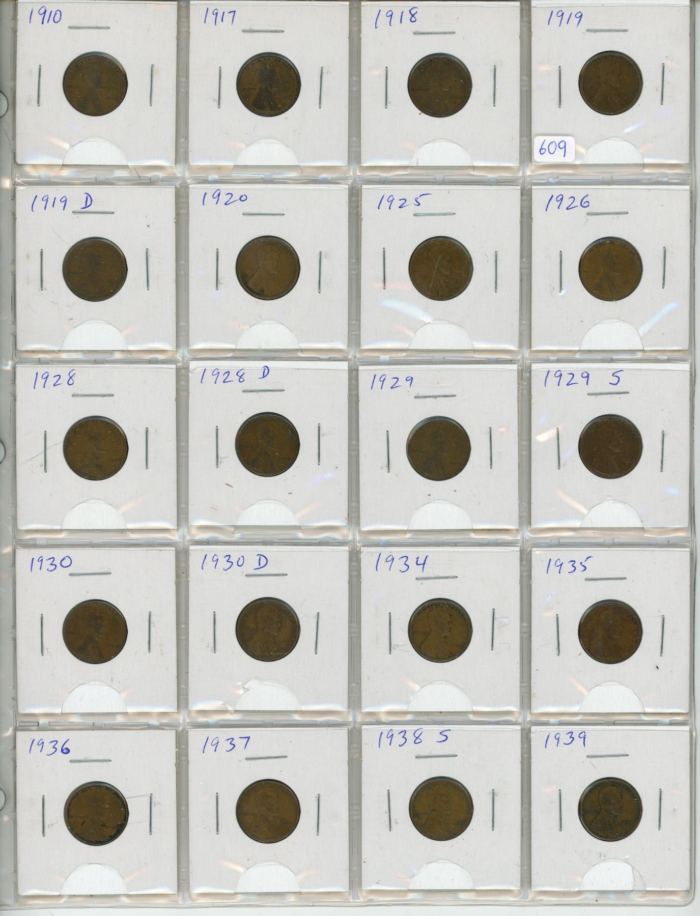 Lot of 20 early U.S. Lincoln Wheat Cents. Includes 1910, 1917, 1918, 1919, 1919D, 1920, 1925, 1926, 1928, 1928D, 1929, 1929S, 1930, 1930D, 1934, 1935, 1936, 1937, 1938S & 1939.