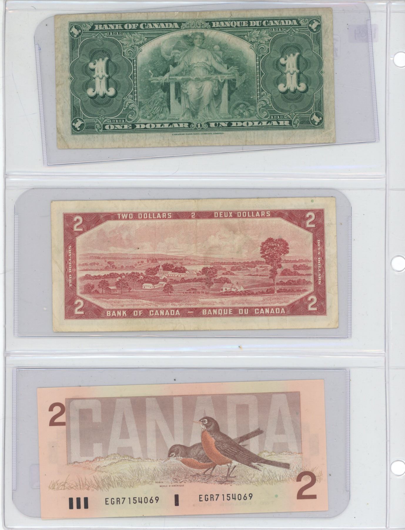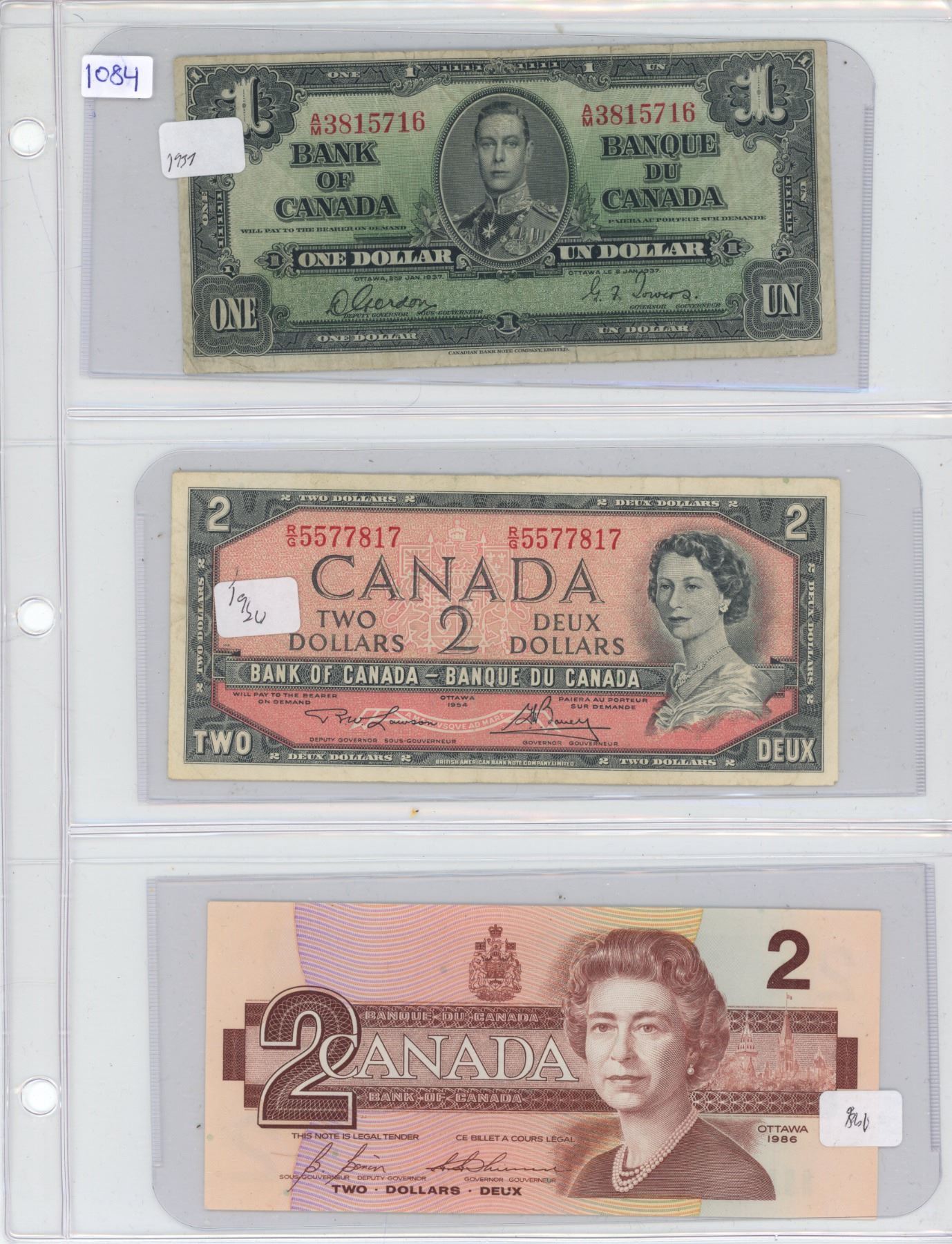 Lot of 3 (1937-$1, 1954-$2 and 1986-$2) canadian bills