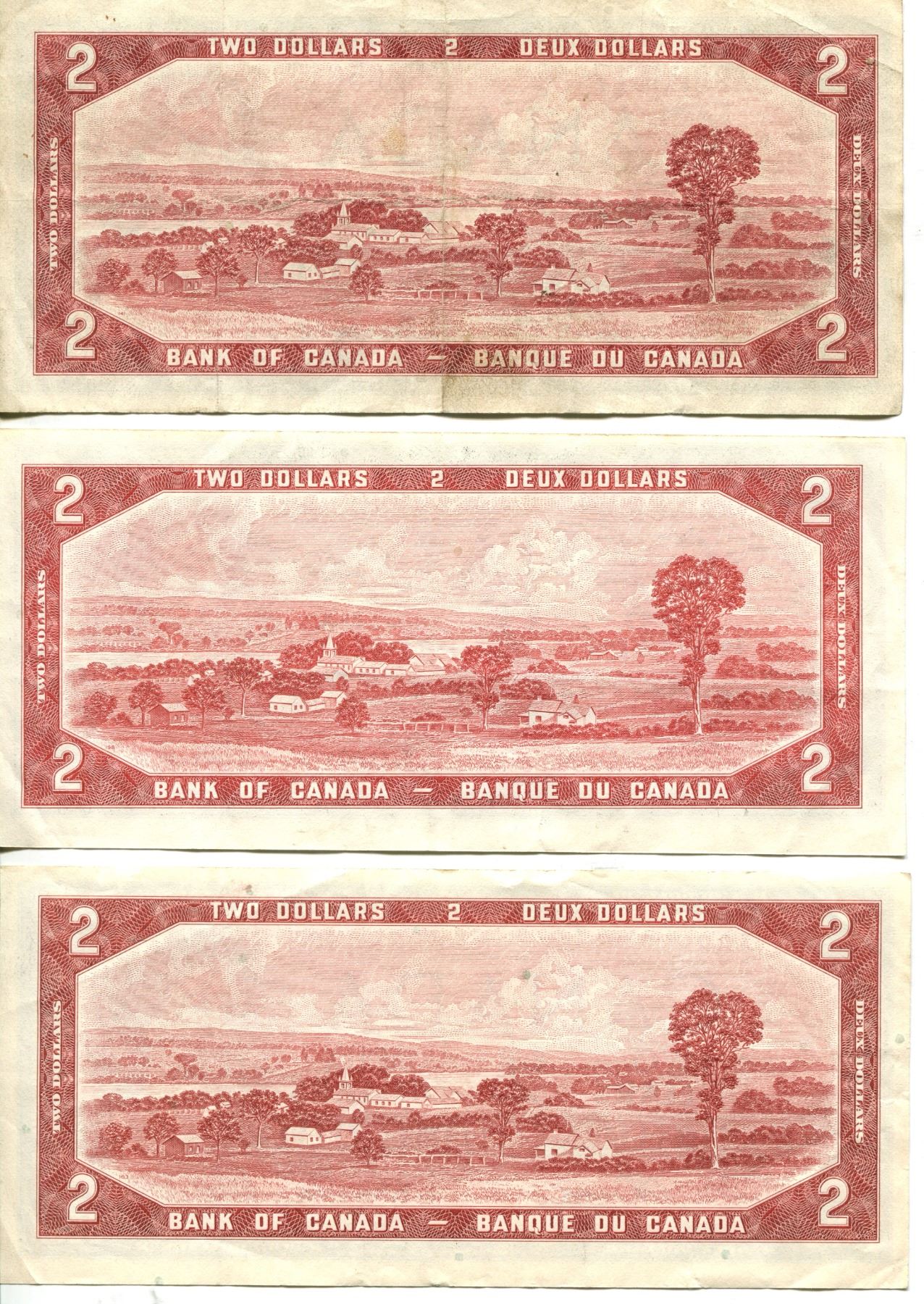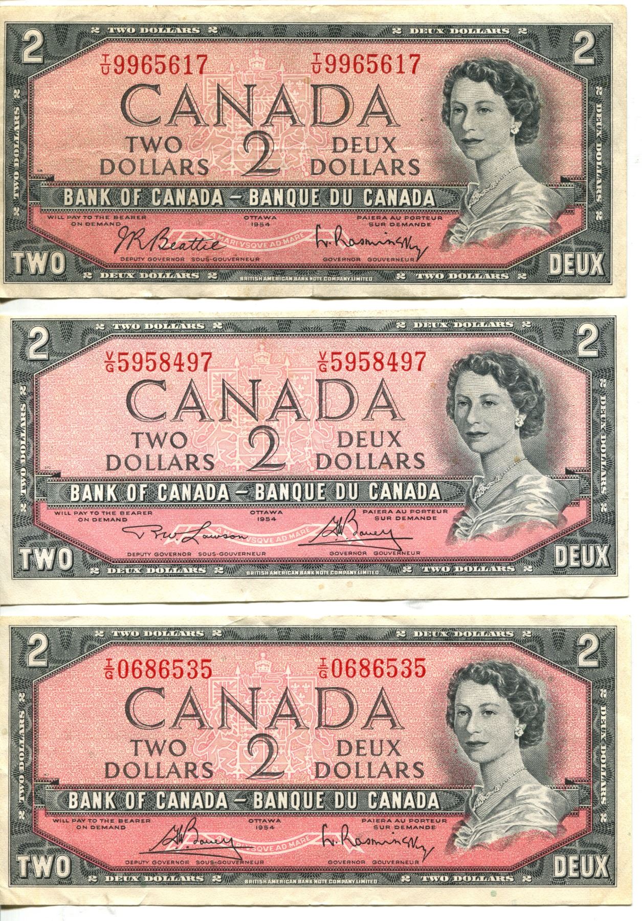 Lot of 3 1954 Canada $2 bills, Beattie/Rasminsky (T/U 9965617), Bouey/Rasminsky (T/G 0686535), Lawson/Bouey (V/G 5958497)