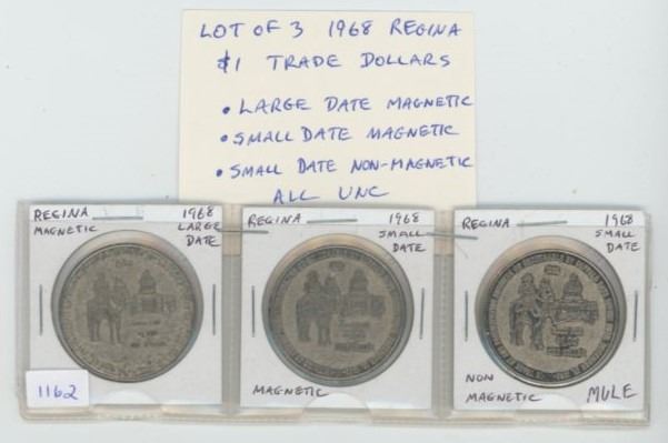 Lot of 3 1968 Regina $1 Trade Dollars. Includes all 3 varieties: Large Date, Magnetic; Small Date, Magnetic; Small Date, Non-Magnetic. All Unc. Nice.