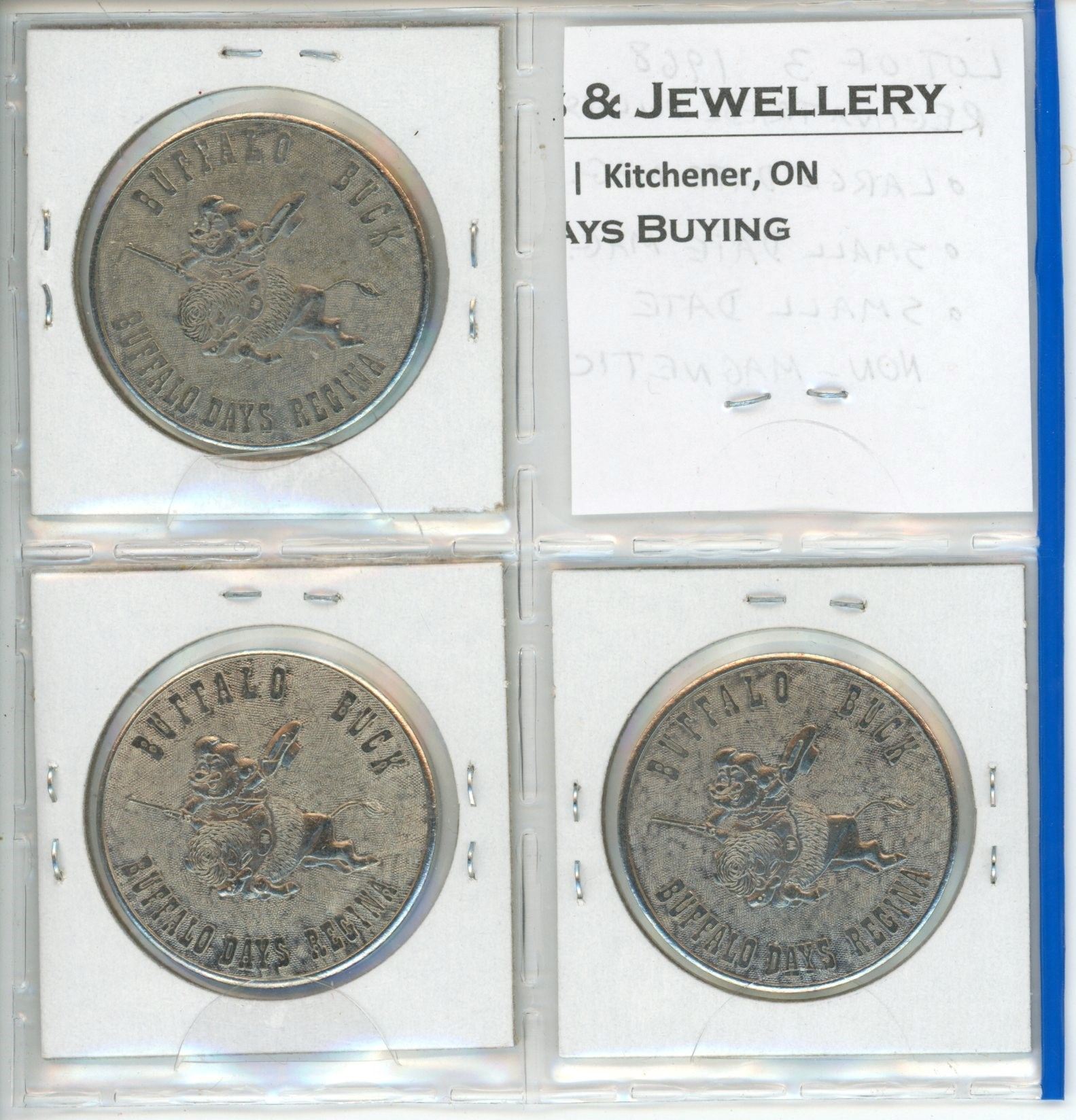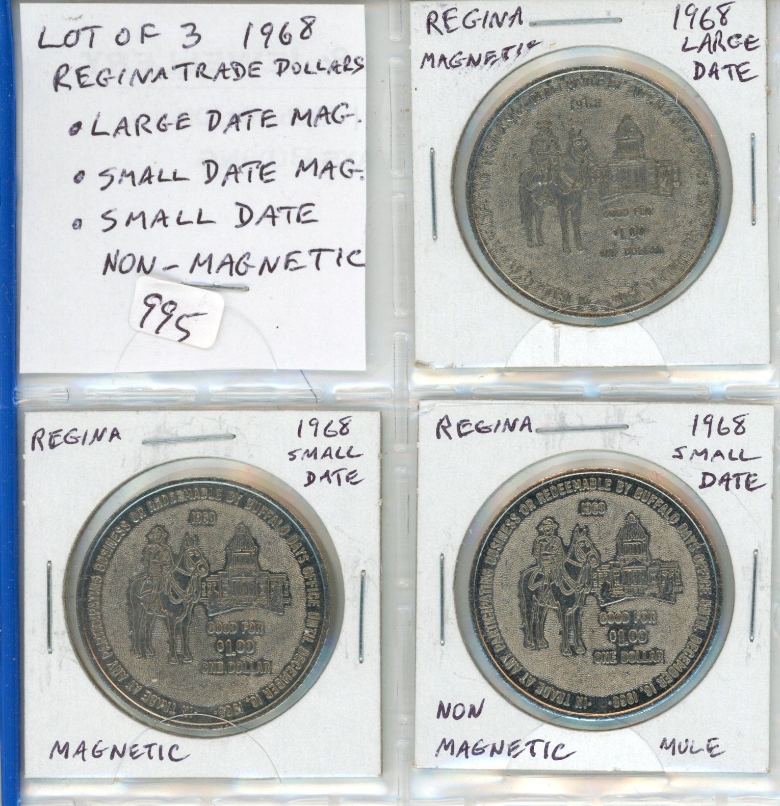 Lot of 3 1968 Regina Trade Dollars. Large Date Magnetic; Small Date Magnetic; Small Date Non-Magnetic Mule. All Unc.
