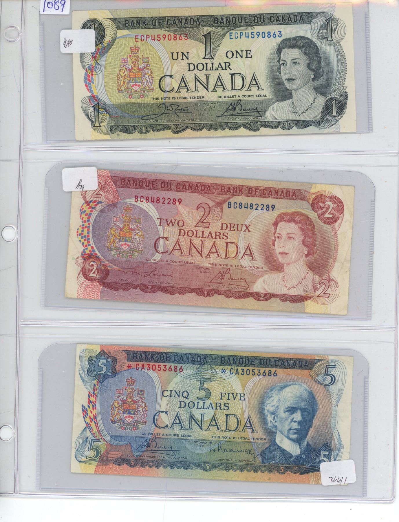 Lot of 3 (1973-$1, 1974-$2 and 1972-$5) canadian bills