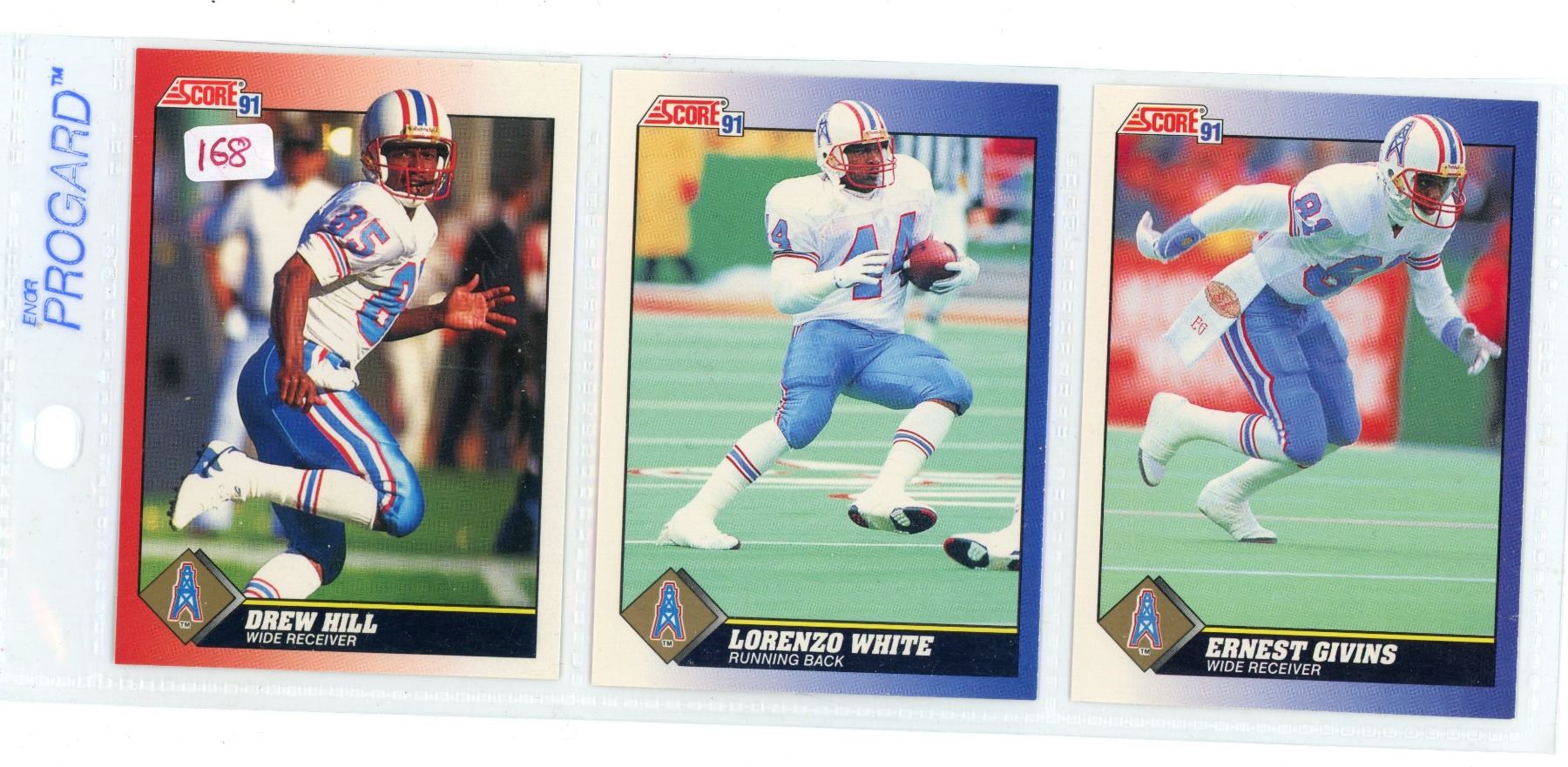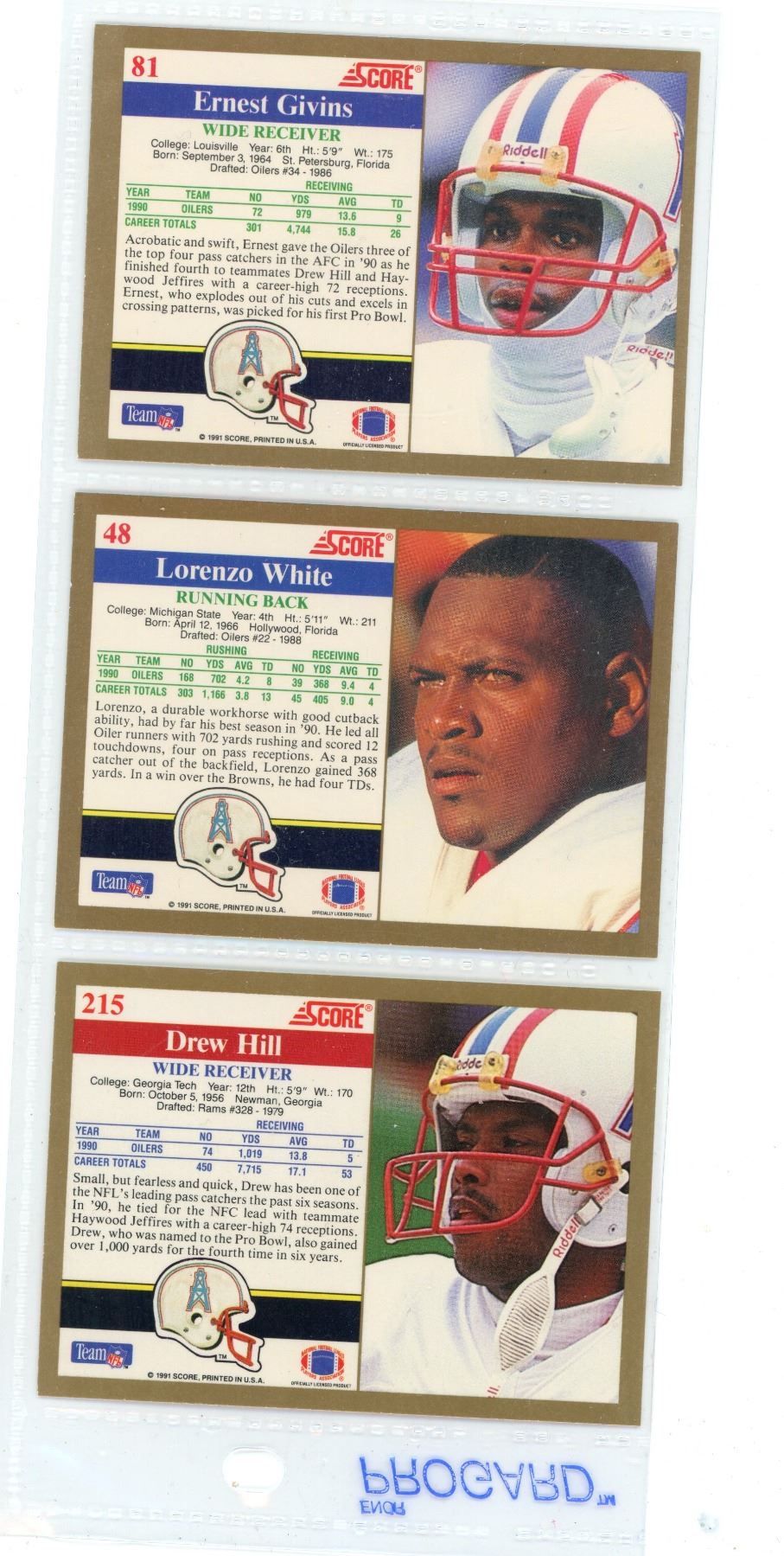 Lot of 3 1991 Score NFL football cards for the Houston Oilers: Drew Hill, Lorenzo White & Ernest Givins. Mint.