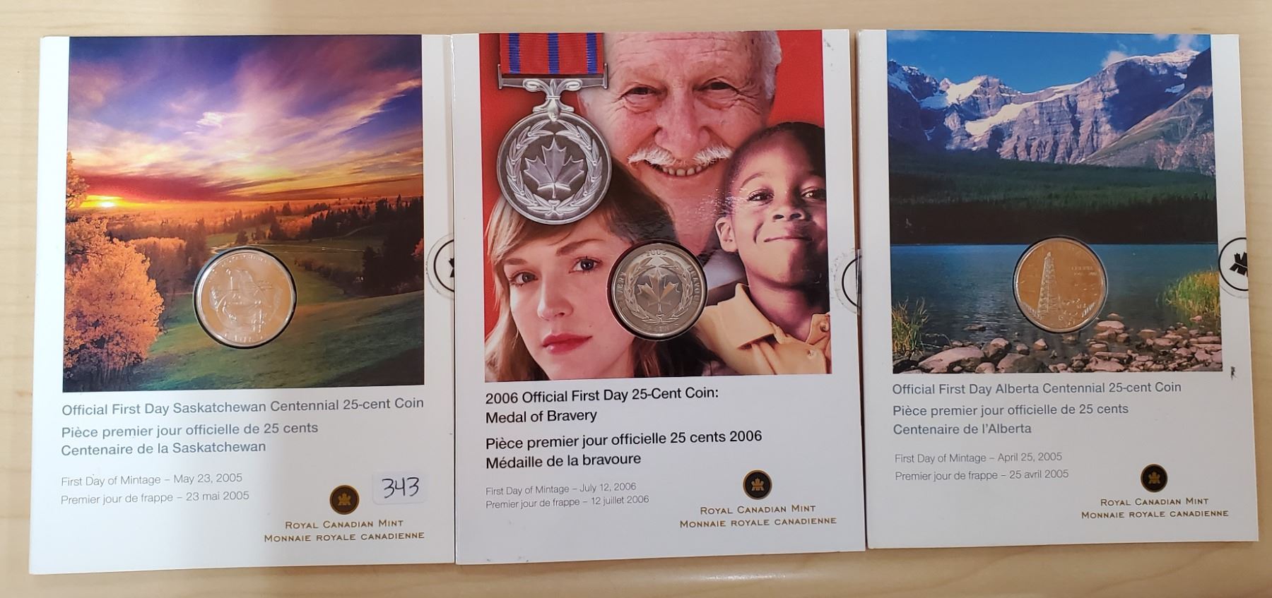 Lot of 3: 2005 Official First Day Sask, Alberta & 2006 Medal of Bravery 25¢