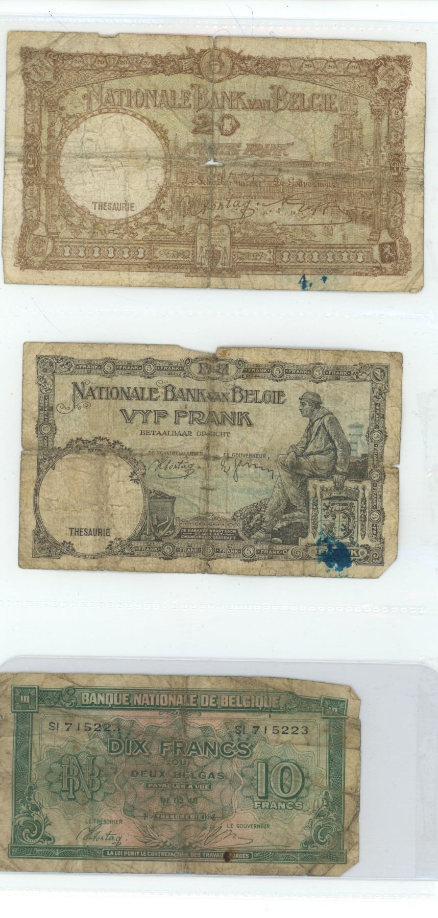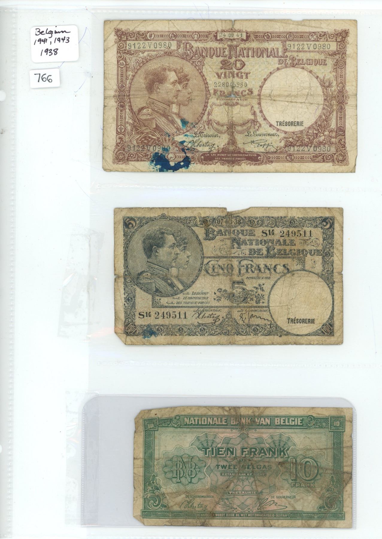 Lot of 3 Belgium bils: 5 francs (1938), 10 francs (1943), 20 Francs (1941)
