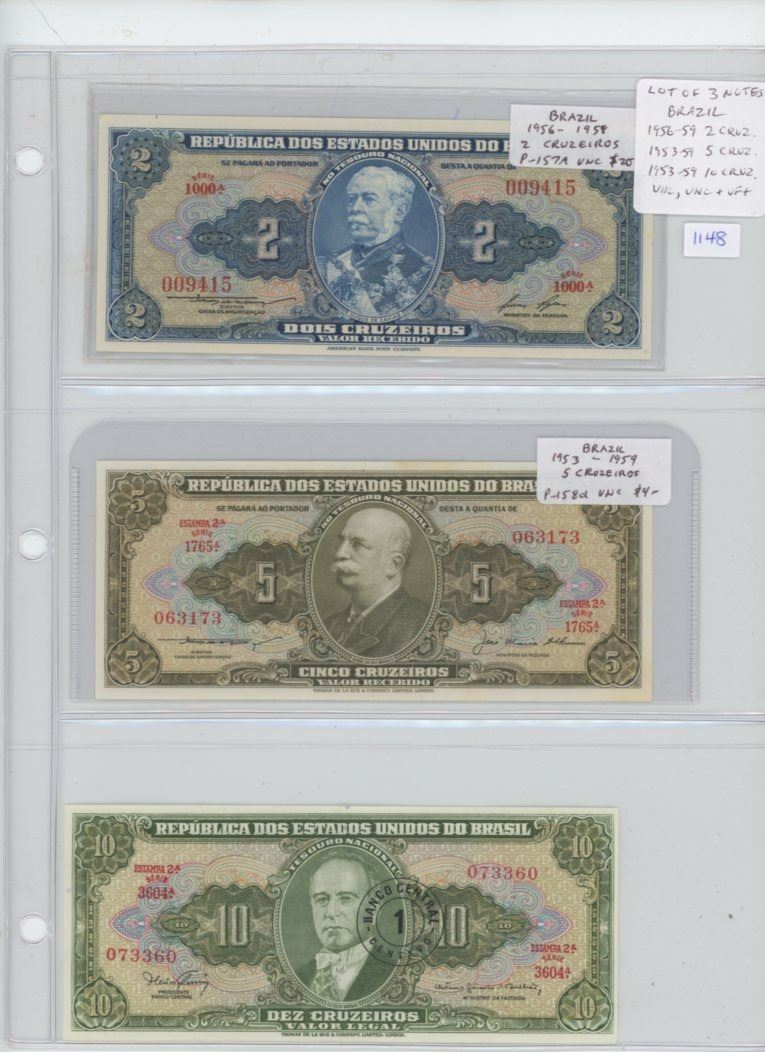 Lot of 3 Brazil notes. 1956-1959 2 Cruzeiros, 1953-1959 5 Cruzeiros, and 1953-1959 10 Cruzeiros. 2 notes are Unc, one is VF+. Nice.