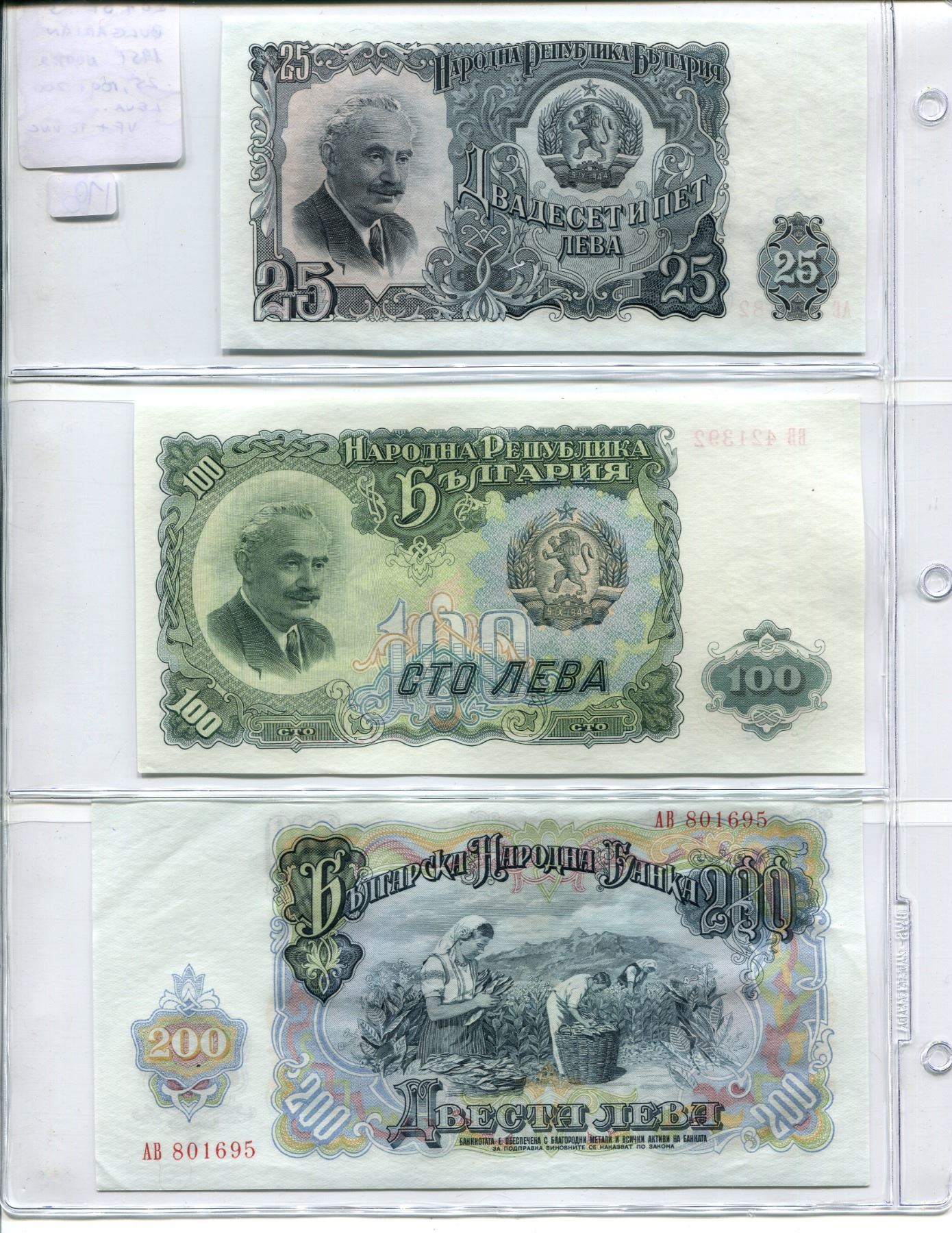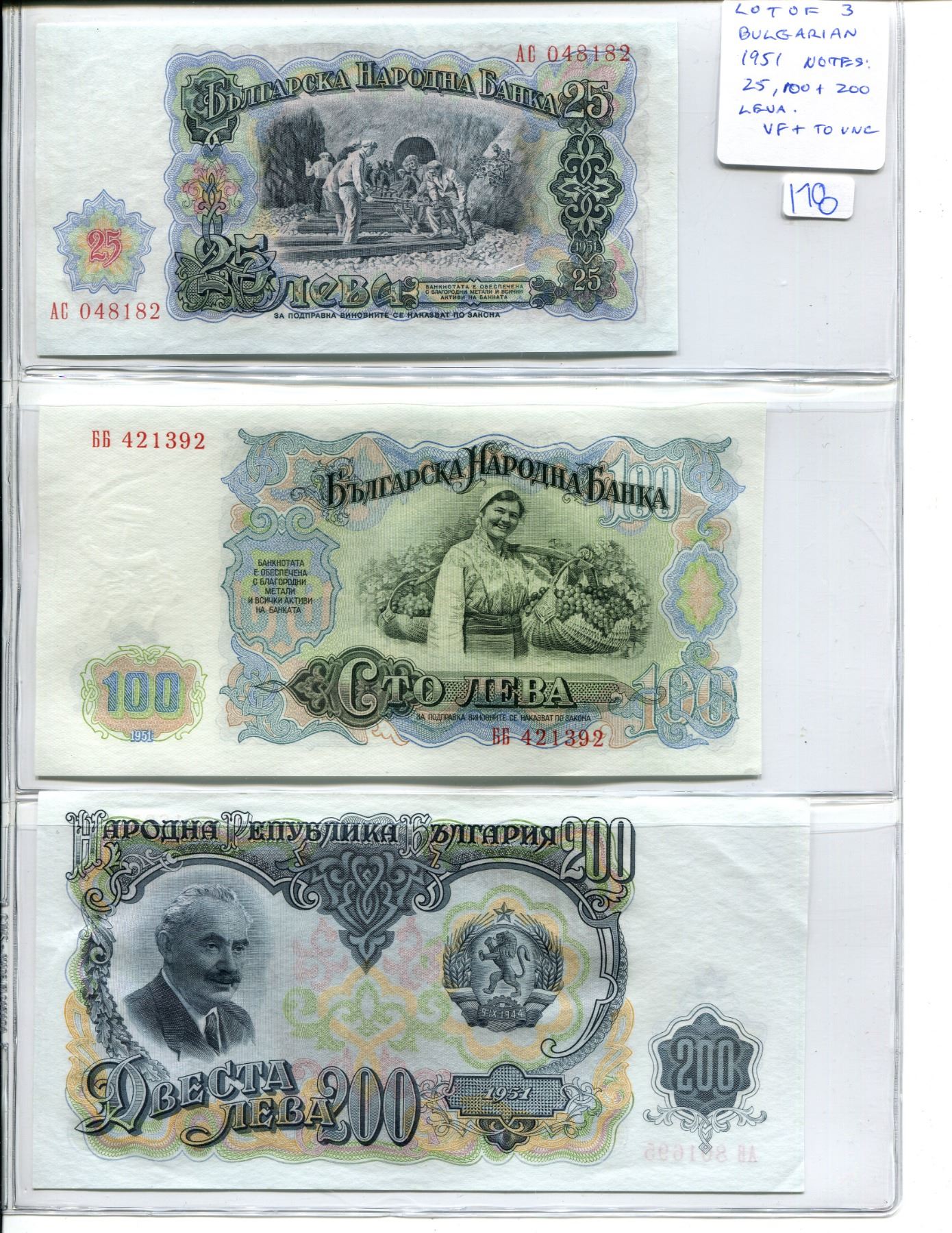 Lot of 3 Bulgarian 1951 notes: 25 Leva, 100 Leva & 200 Leva. VF+ to Unc.