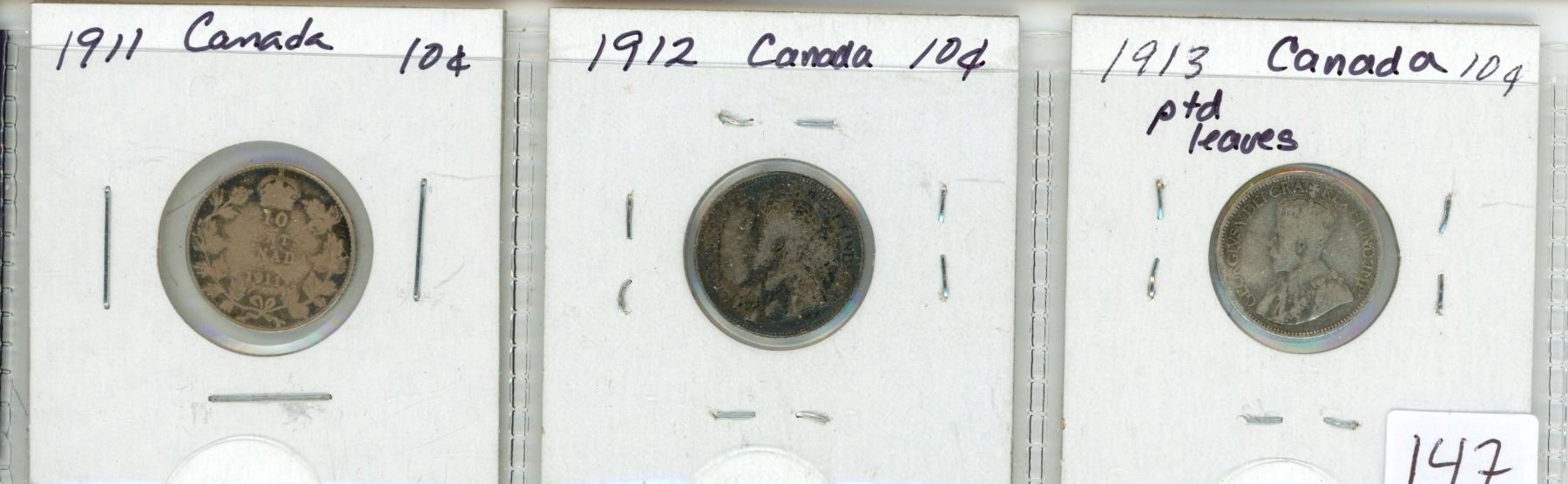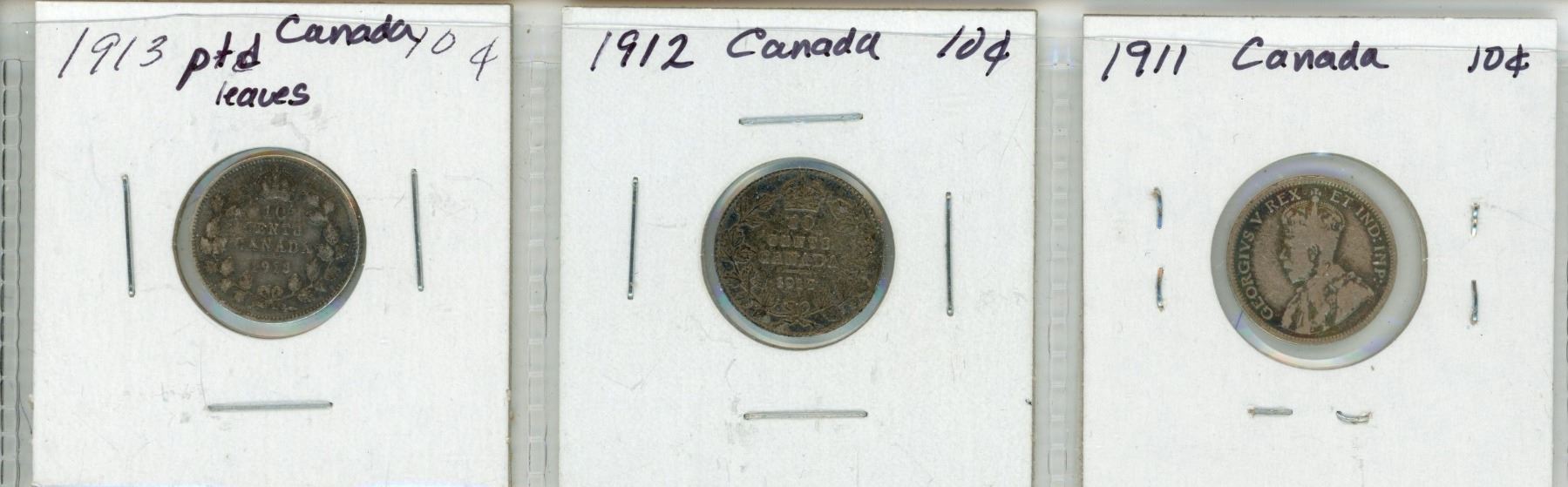 Lot of 3 Canada 10¢: 1911, 1912, 1913 PTD Leaves