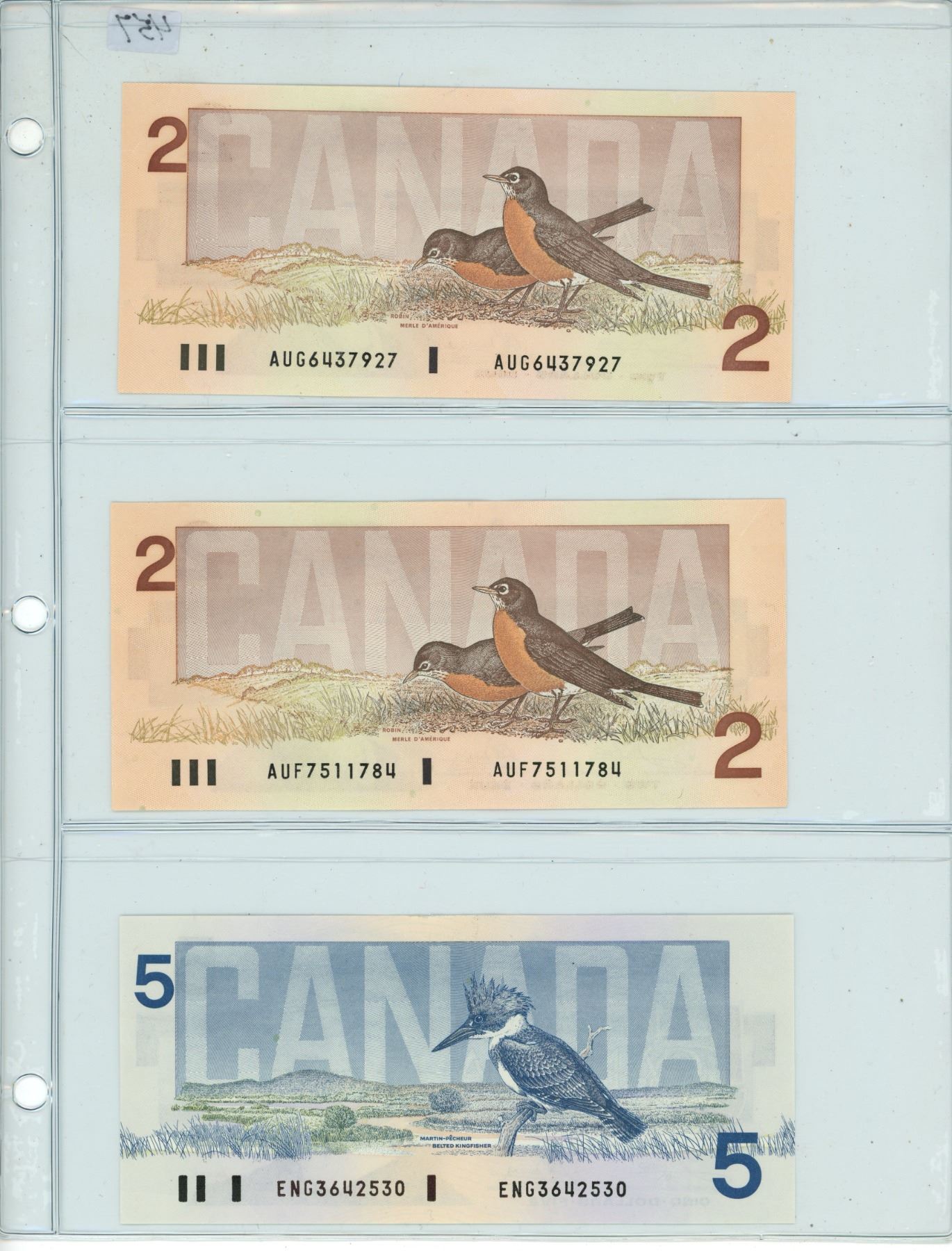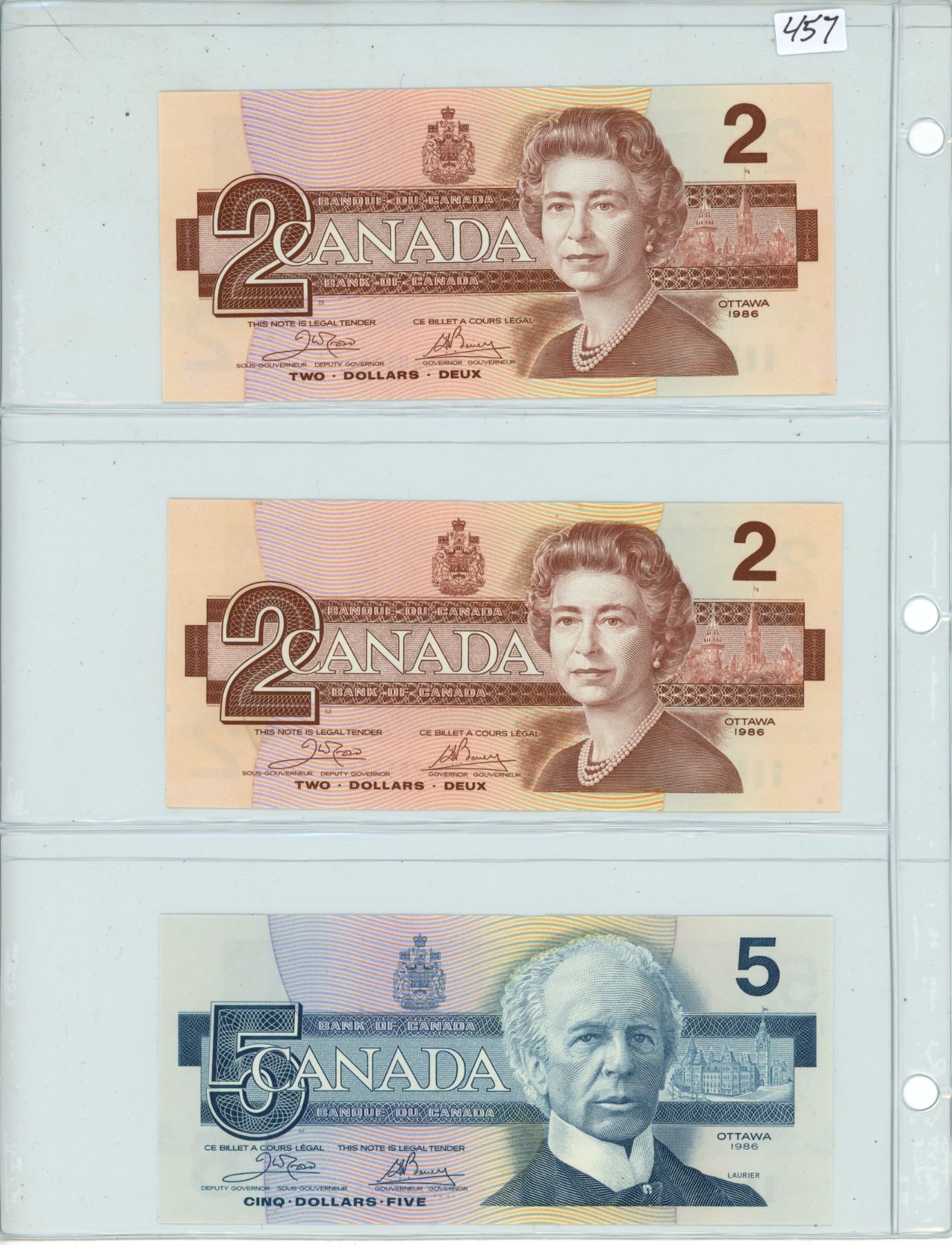 Lot of 3 Canada notes: 1986 $2 Crow/Bouey, AUG 6437927; 1986 $2 Crow/Bouey