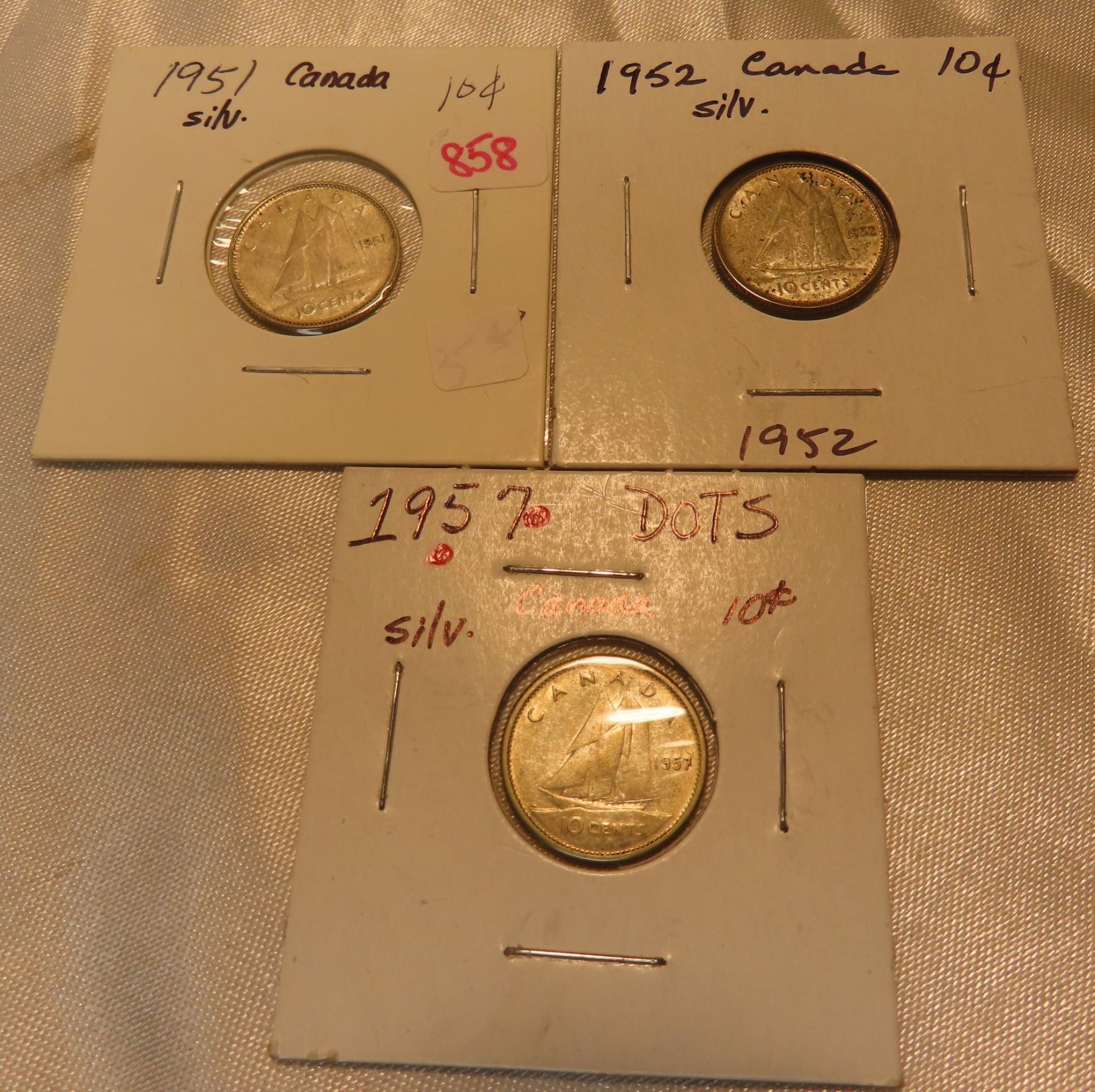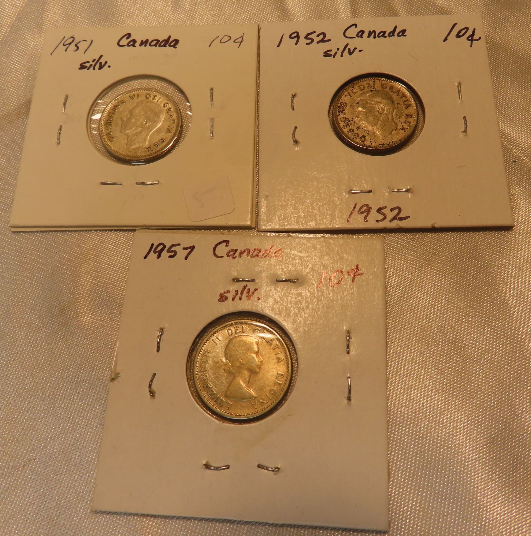 Lot of 3 Canada silver 10 cent -1951,1952, 1957 dots