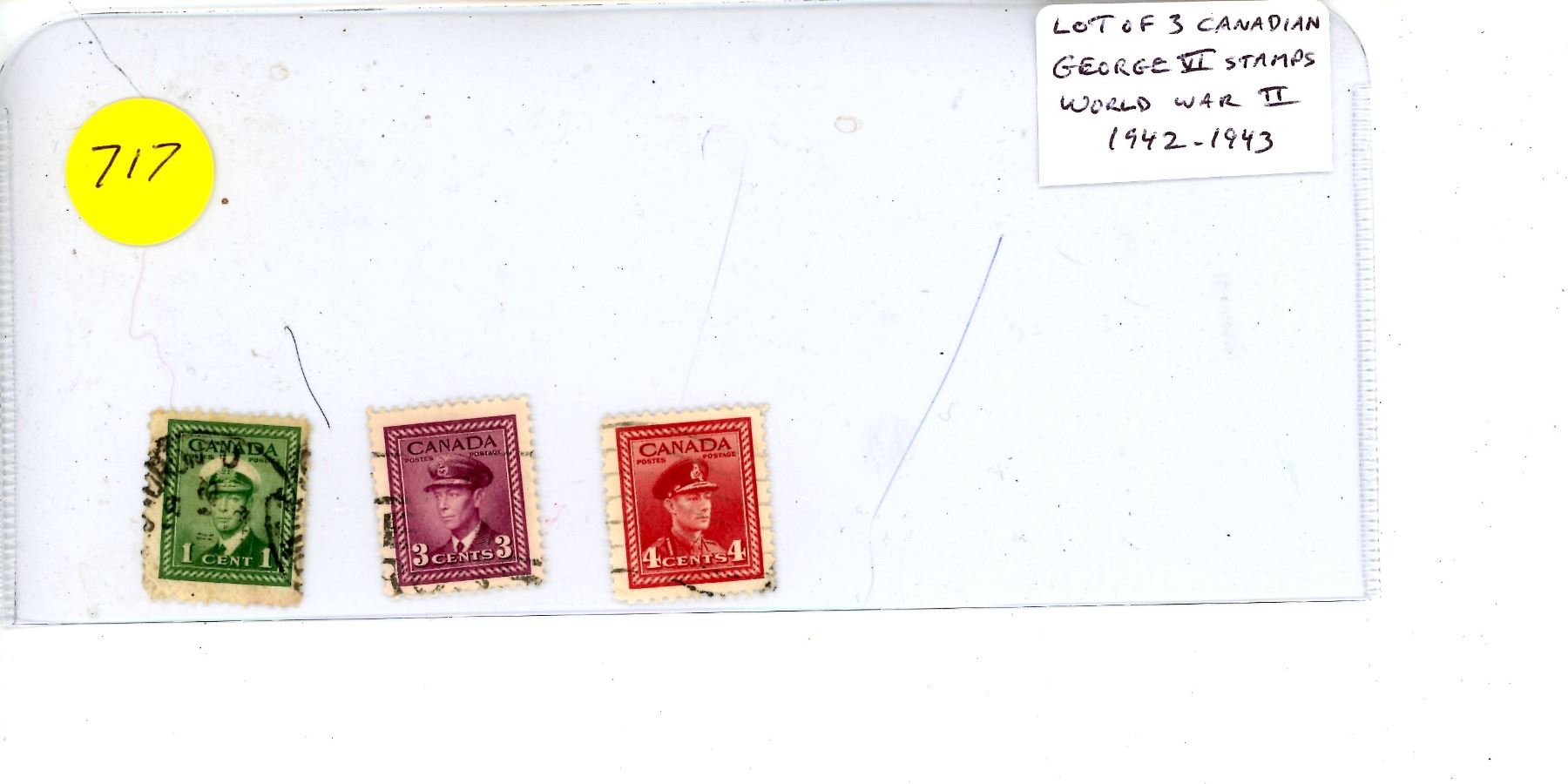 Lot of 3 Canadian George VI stamps depicting the King in military uniform issued during World War II (1942-1943). Used.