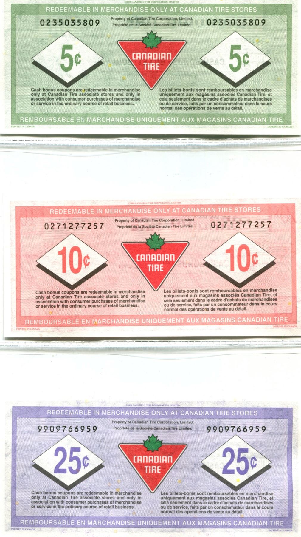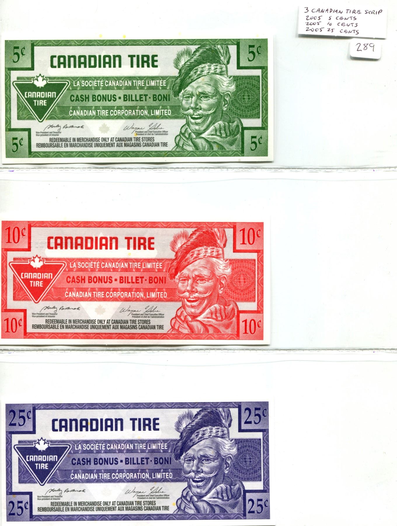 Lot of 3 Canadian Tire Money Scrip. Includes 2005 5 Cents, 2005 10 Cents, 2005 25 Cents. All AU or better.