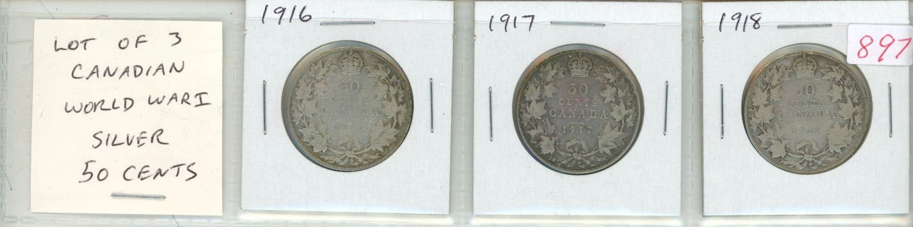 Lot of 3 Canadian World War I Silver 50 Cents. Includes 1916, 1917 & 1918. Coins grade VG-8.