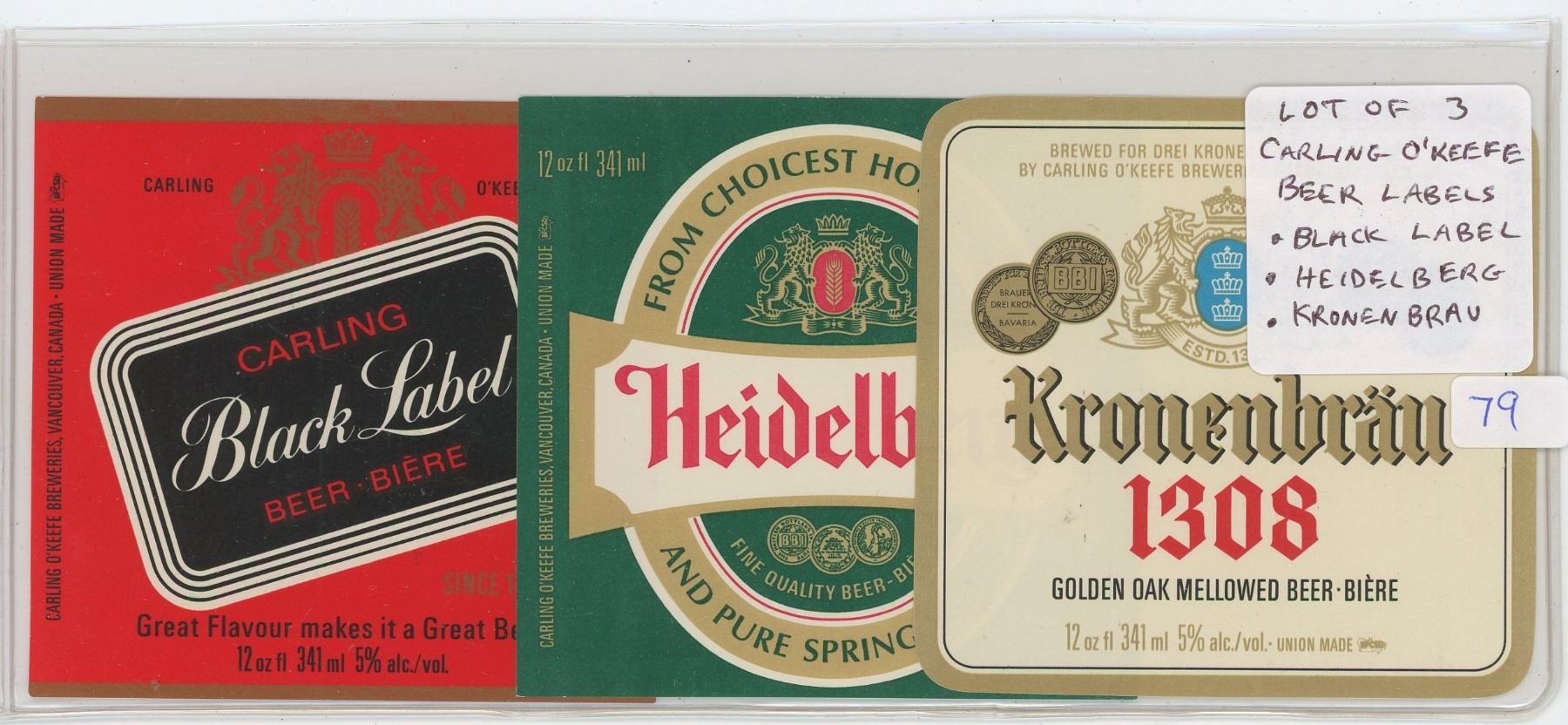 Lot of 3 Carling-O’Keefe Beer Labels: Black Label, Heidelberg, Kronenbrau. Unc.
